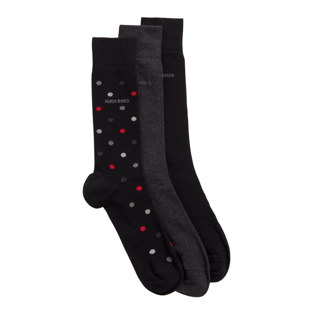 Three pairs of regular-length socks by BOSS. Presented in a branded gift box, these socks are crafted in cotton-rich yarns with stretch and detailed with subtle BOSS logos. This pack offers one pair with a colourful polka dot and two with plain finishes.