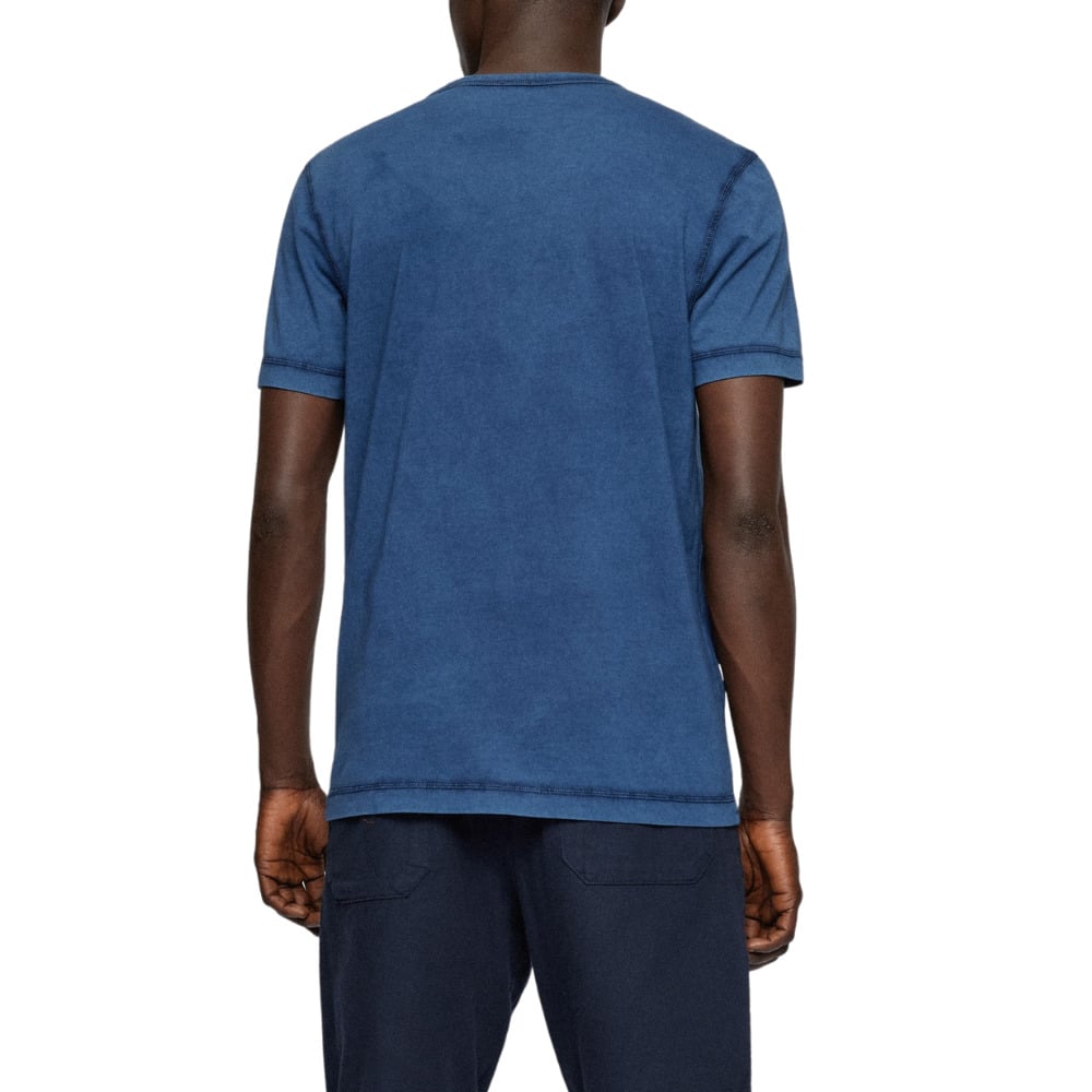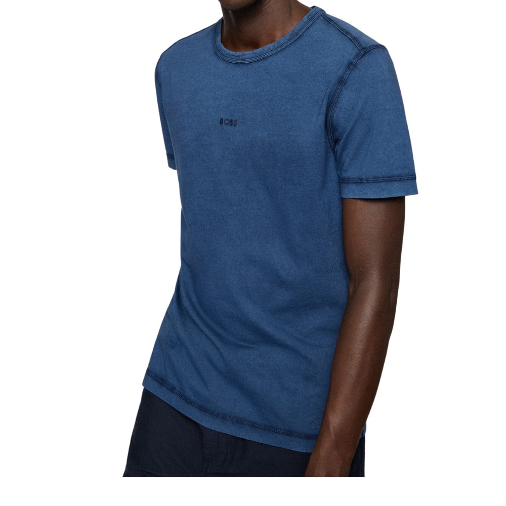 This BOSS Tokks Dark Blue garment dyed organic Cotton T-Shirt by BOSS Menswear is cut to a straight fit in organic-cotton jersey. Garment dyed to achieve a sun-bleached effect, this T-shirt is detailed with a BOSS logo at the centre chest for signature appeal.