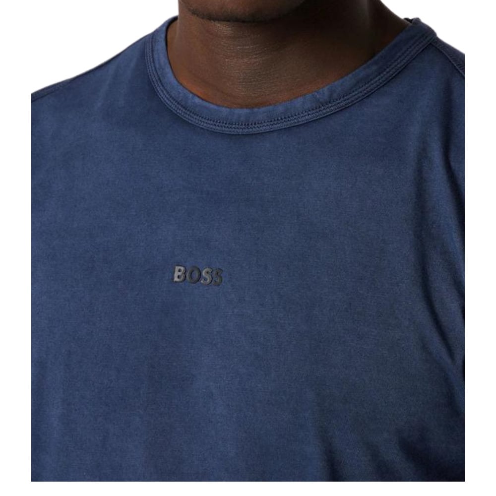 This BOSS Tokks Dark Blue garment dyed organic long sleeved Cotton T-Shirt by BOSS Menswear is cut to a straight fit in organic-cotton jersey. Garment dyed to achieve a sun-bleached effect, this T-shirt is detailed with a BOSS logo at the centre chest for signature appeal.