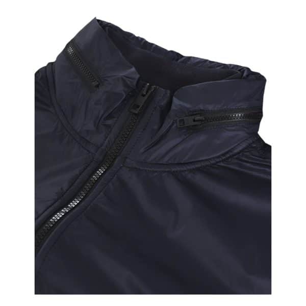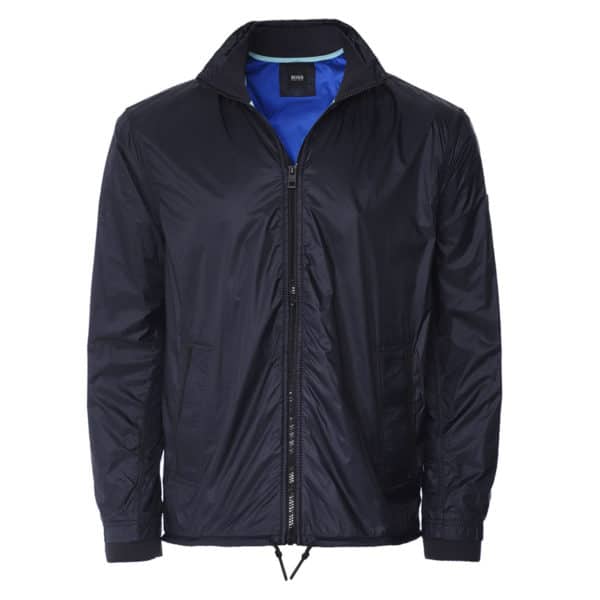 This navy blouson jacket by BOSS Menswear Boss assures protection against the rain. Featuring a stand collar with concealed hood, zip-through fastening and ribbed trims, and the drawstring hem further enhances the jacket’s protective qualities. The jacket is complete with press stud hand pockets, with the silicone brand badge to the sleeve.