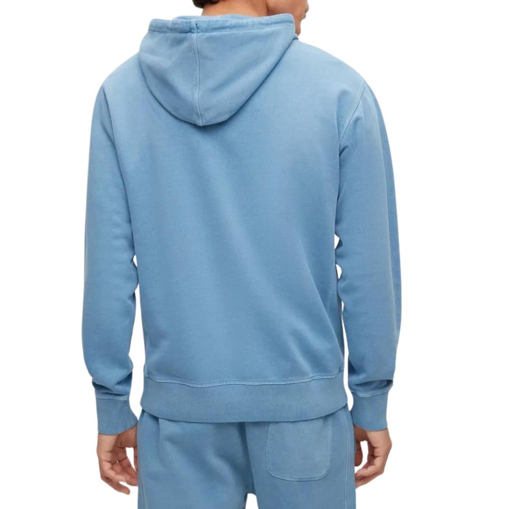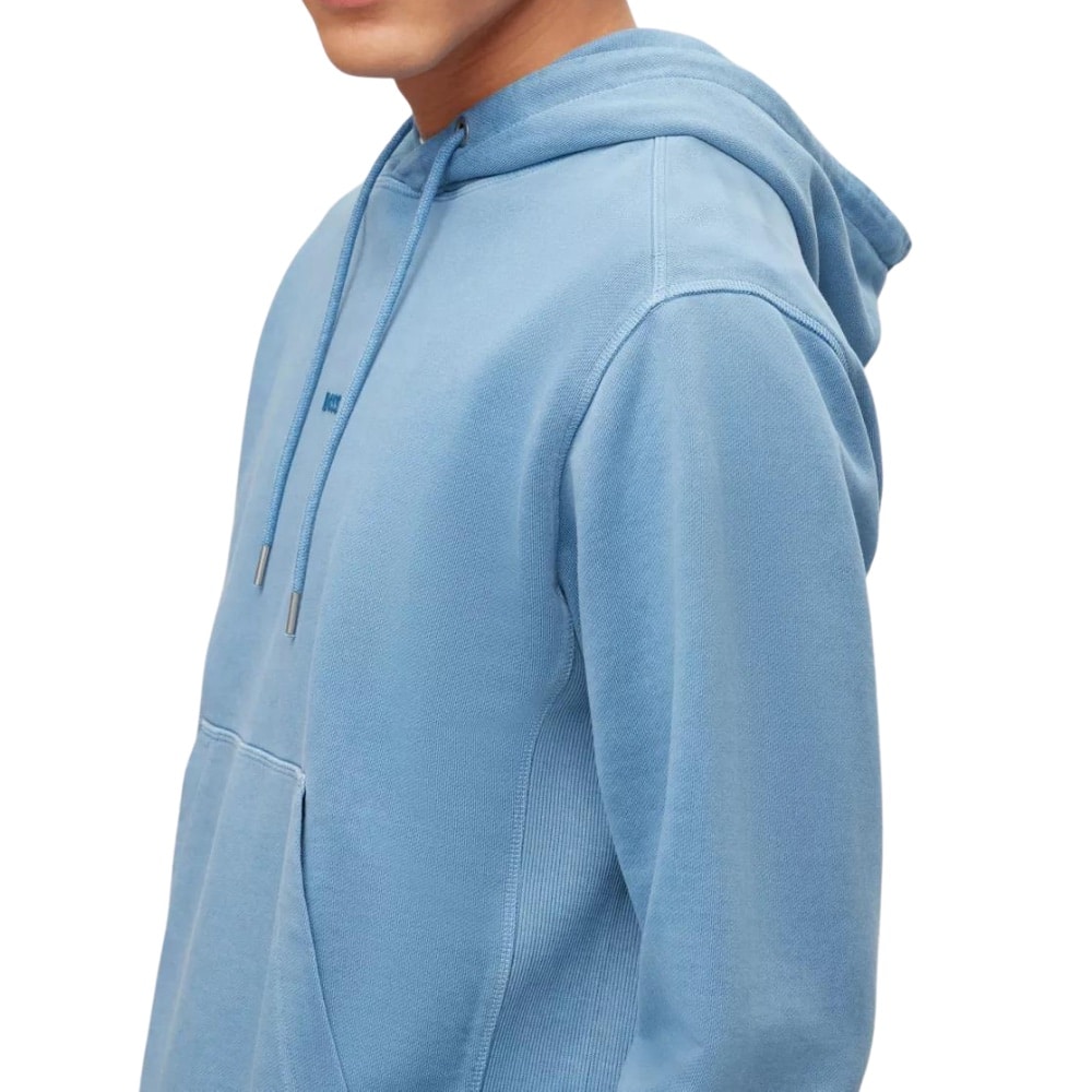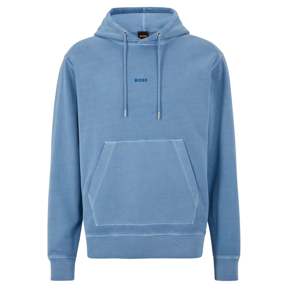 A BOSS Wefadehoody Light Blue hoodie with an adjustable hood by BOSS Menswear. Printed with a tonal BOSS logo at the centre chest, this hoodie is crafted in pure-cotton French terry and garment dyed for casual appeal.