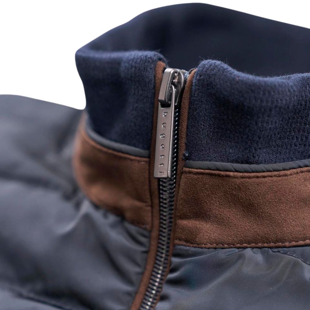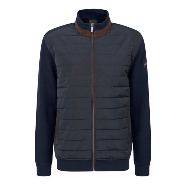 The Bugatti mix media hybrid jacket has two side zip pockets, knit back and sleeves and silver detailing on the zip closure and collar.