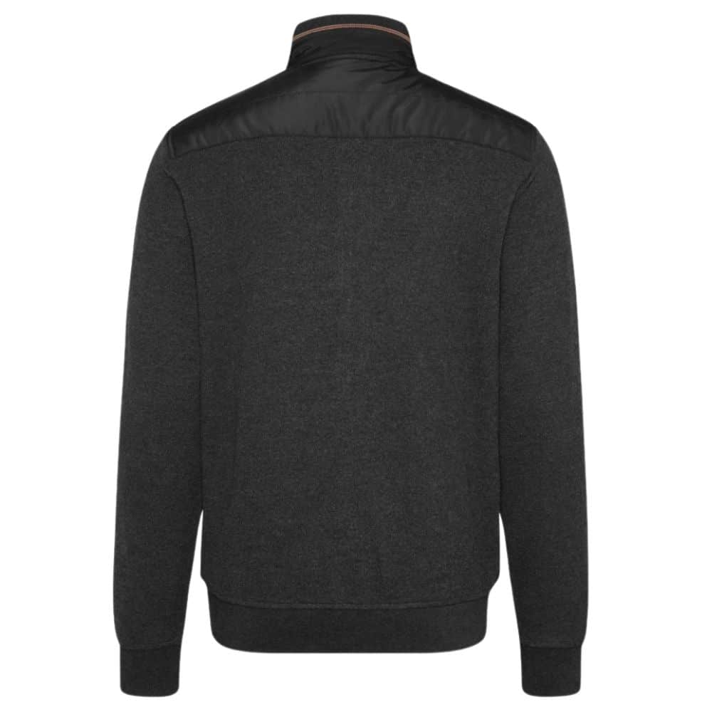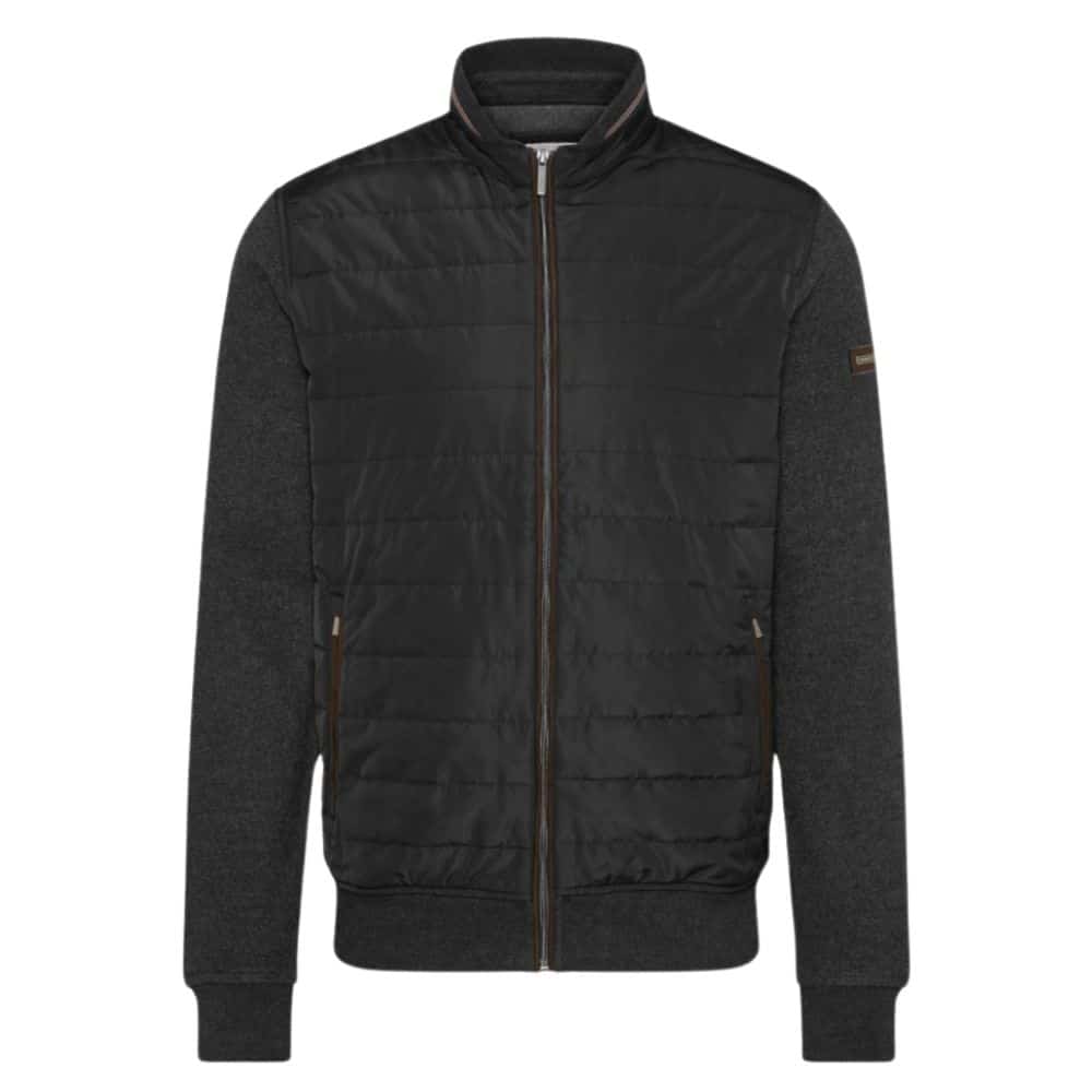 The Bugatti Black quilted hybrid jacket has two side zip pockets, charcoal knitted back and sleeves and brown detailing on the zip closure and collar.