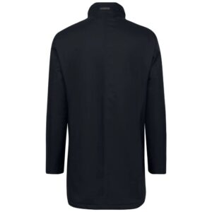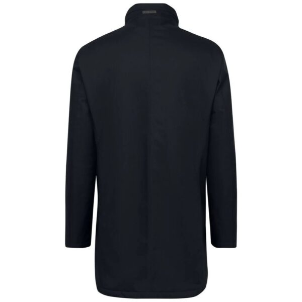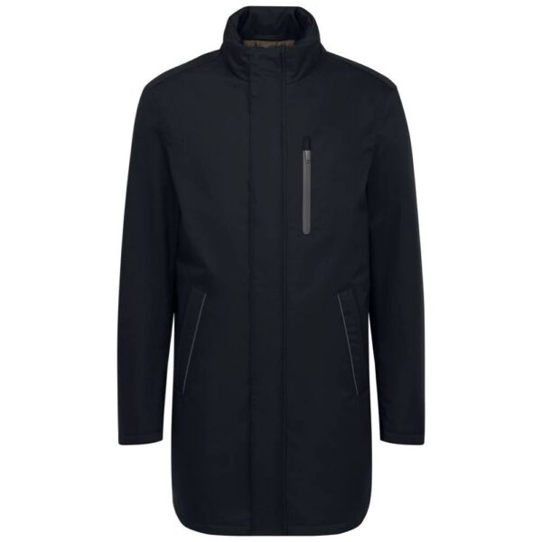 The Bugatti’s rain-series navy jacket in delicately textured fabric with a standing collar with contrast stripe, high-closing zip, detachable quilted yoke, two slit pockets and two water-repellent zip pockets, one welted breast pocket with zip and cuffs with concealed elastic inserts.