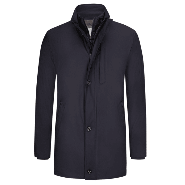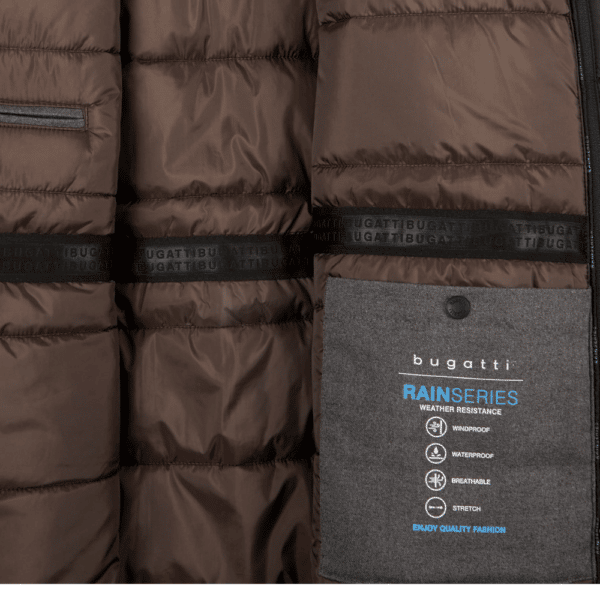 The Bugatti’s rain-series midnight navy jacket in delicately textured fabric with a standing collar with contrast stripe, high-closing zip, detachable quilted yoke, two slit pockets and two water-repellent zip pockets, one welted breast pocket with zip and cuffs with concealed elastic inserts.