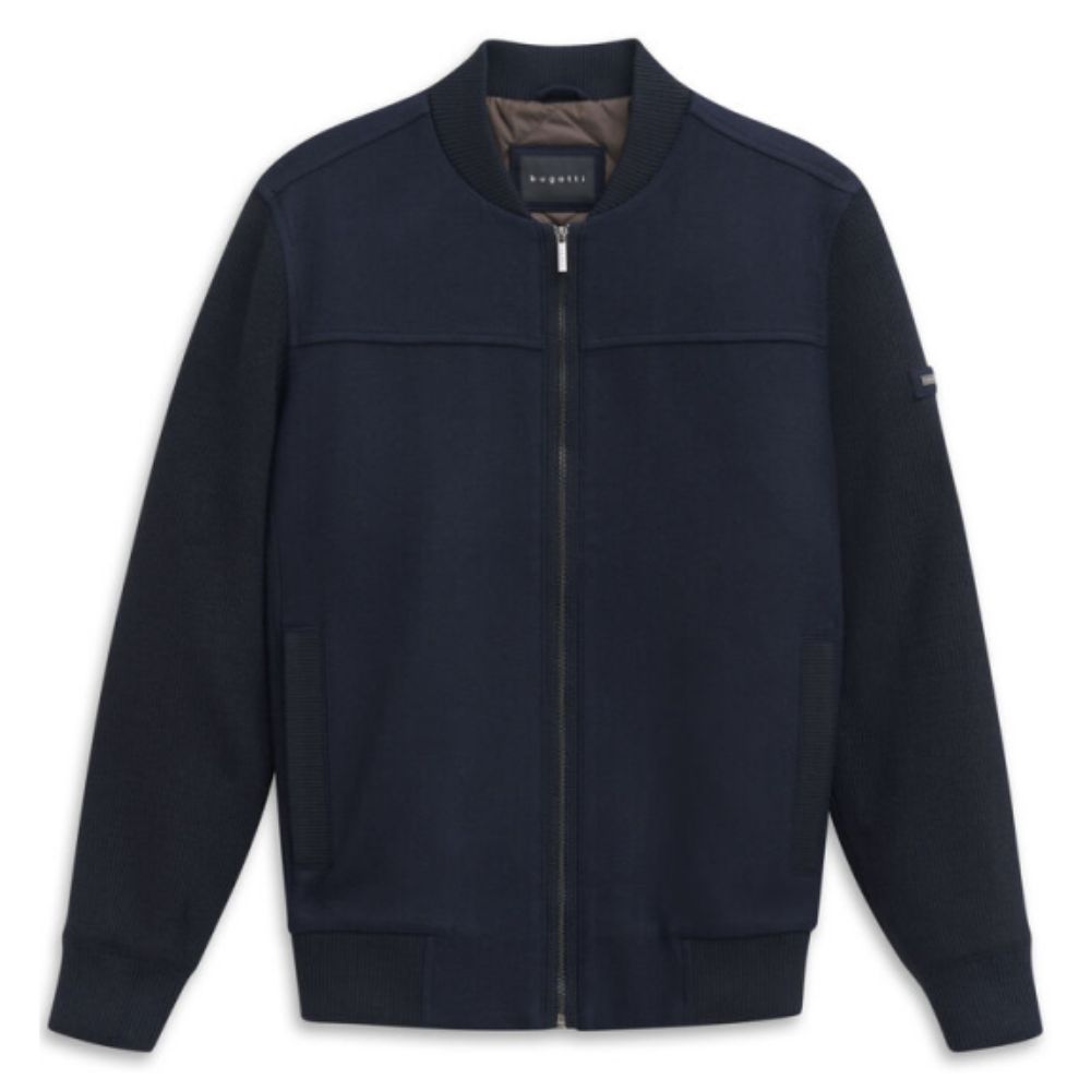The Bugatti wool mix hybrid jacket has two side zip pockets with woolen stretch channeled sleeves and silver detailing on the zip closure with a woolen rounded baseball varsity collar and quilt lined inside for added warmth.