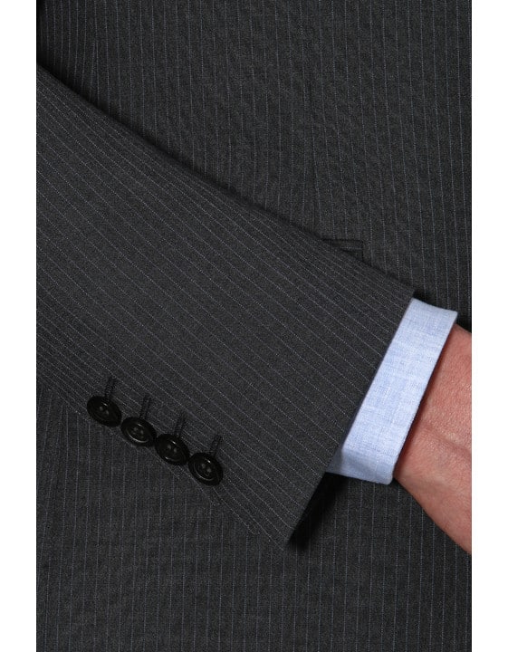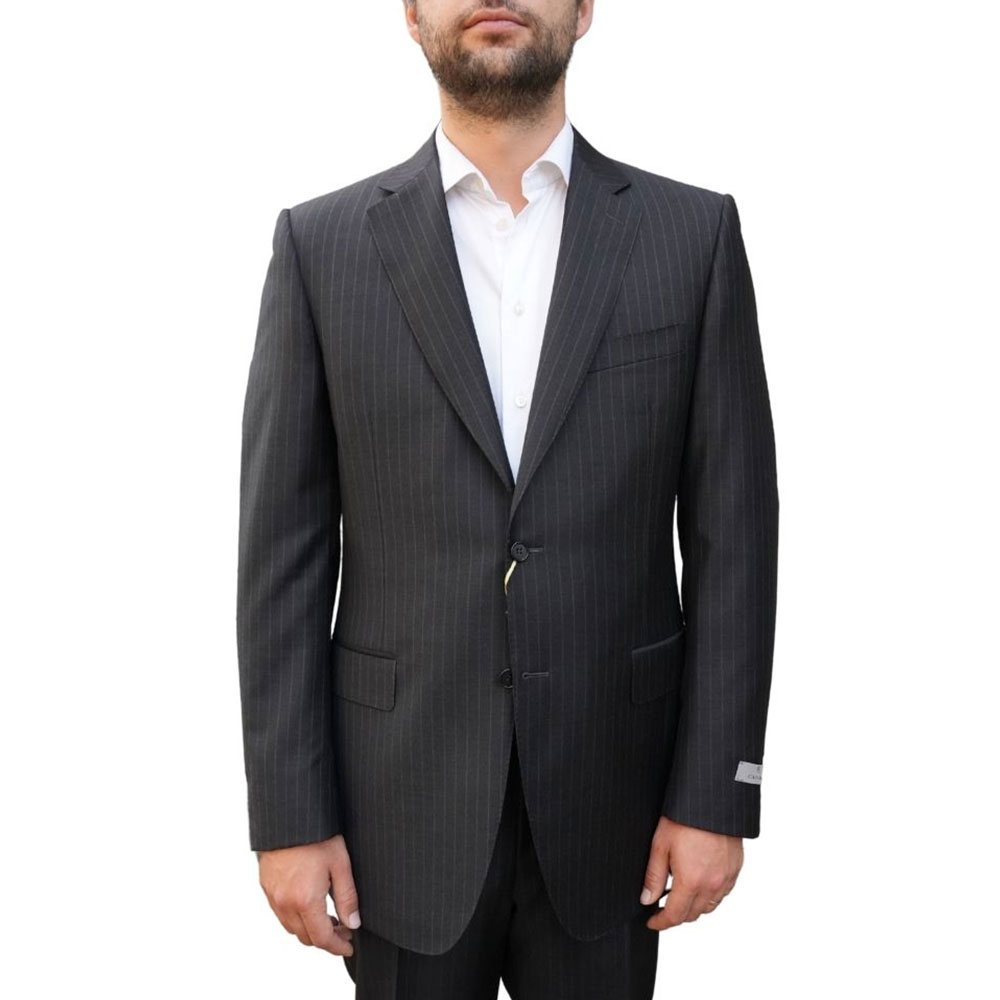 This Canali Charcoal Shadow Stripe Suit is made in Italy and fully hand canvassed for first class quality and craftsmanship. The jacket features two buttons and notch lapels whilst the the trousers have a flat front for a clean, contemporary look. Cut for a contemporary fit, this suit has a modern tailored shape. Canali suits are cut from a fine cloth, and this one is no exception! The cloth is a premier quality pure virgin wool and features a woven shadow stripe for subtle yet handsome detail.