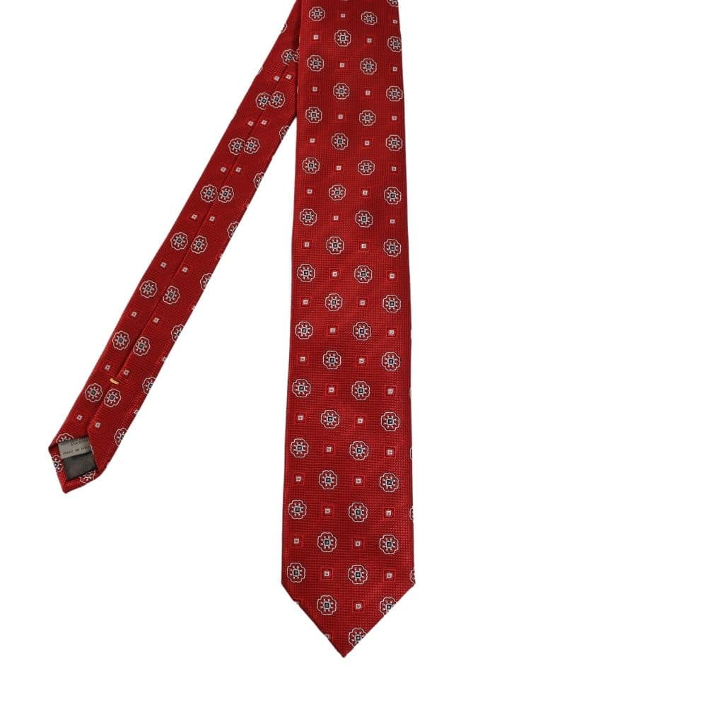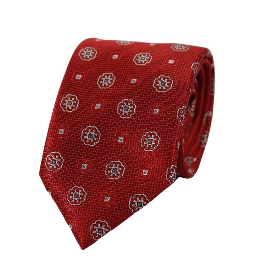 The Canali Medallions and Squares Tie in Red features embroidered medallions and smaller squares, set on a red background with a very fine micro square texture. Made in Italy from silk and comes presented in a branded tie sleeve.