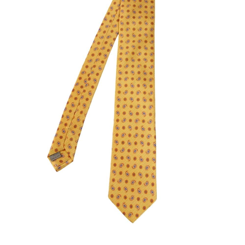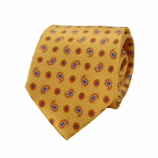 The Canali Paisley Leaf Tie in Yellow features a red mosaic and blue paisley leaf design, set on a square patterned background for contrasting detail. Made in Italy from fine silk to ensure high quality and presented in a branded sleeve.