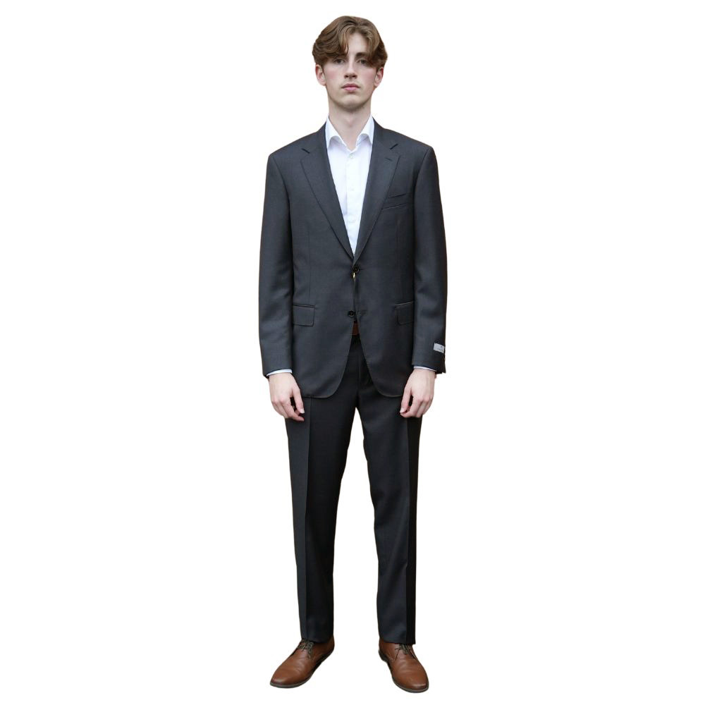 This Canali charcoal pure new wool suit is made in Italy from a super light wool fabric with a fine texture and soft, airy feel. This suit consists of two pieces: a two button jacket with notch lapels and fully hand canvassed construction, and flat front trousers with tapered leg. Cut to a contemporary fit, this suit offers generous room with a slightly fitted look.