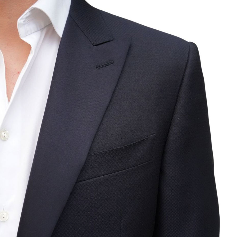 The suit jacket features a tailored fit with a structured silhouette, striking peaked lapels, and a single-button front closure, offering a sleek, modern look. The smooth, breathable wool ensures comfort throughout the day, while the fully lined interior provides a polished finish.