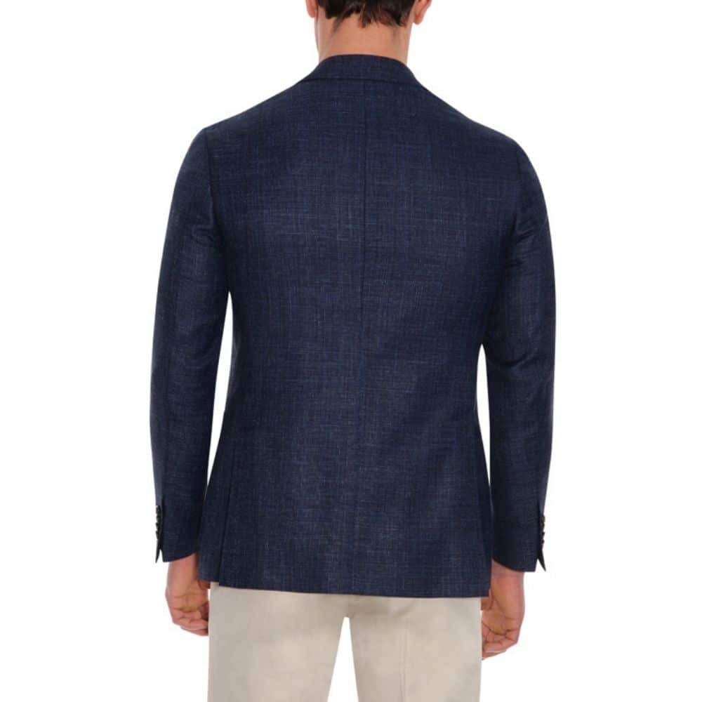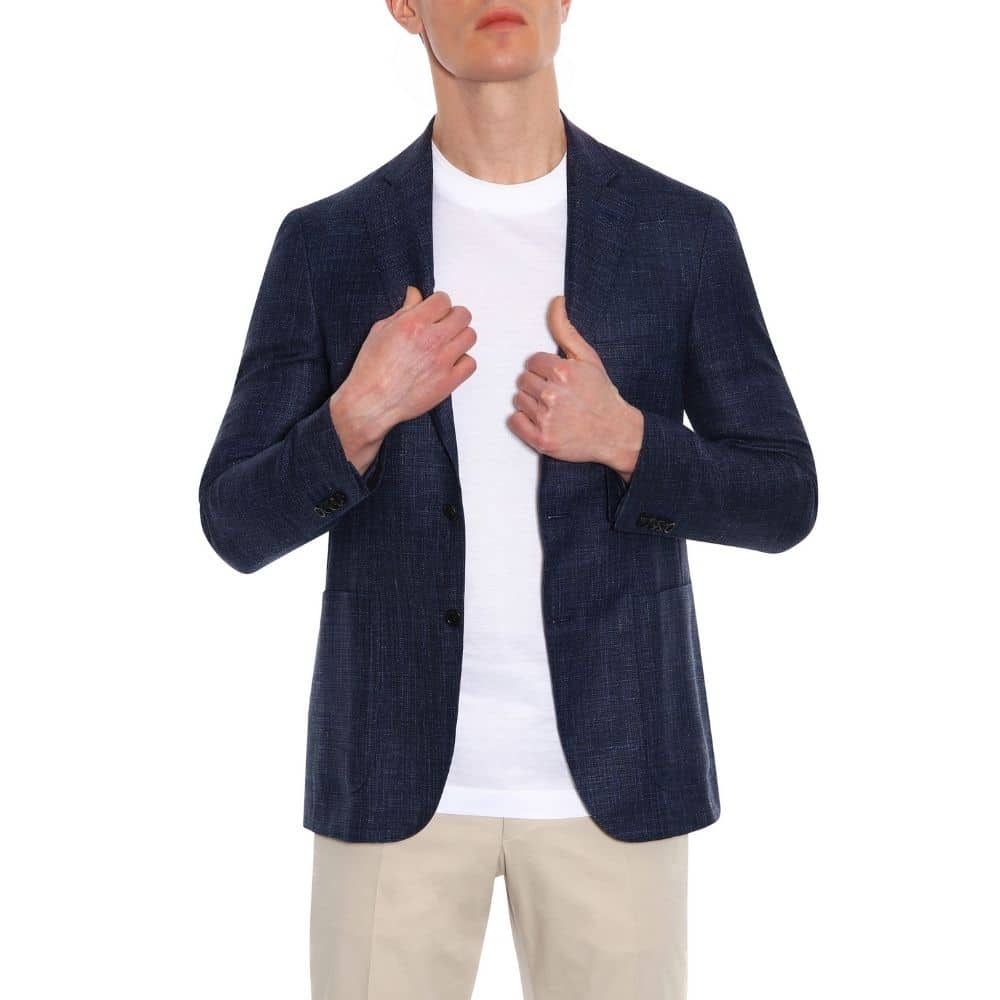 Made in Italy from a luxury fabric, this Canali Wool Silk and Linen Smart Jacket in a Cool Navy colour is an elegant and refined solution to sophisticated dressing. Cut to Canali’s ‘Kei’ slim fit and unlined, the jacket looks both sharp and modern when worn whilst also being comfortable. The fabric is lightweight to be cool in summer and is woven from different shades of blue threads, which add a hint of texture and detail to the jacket.