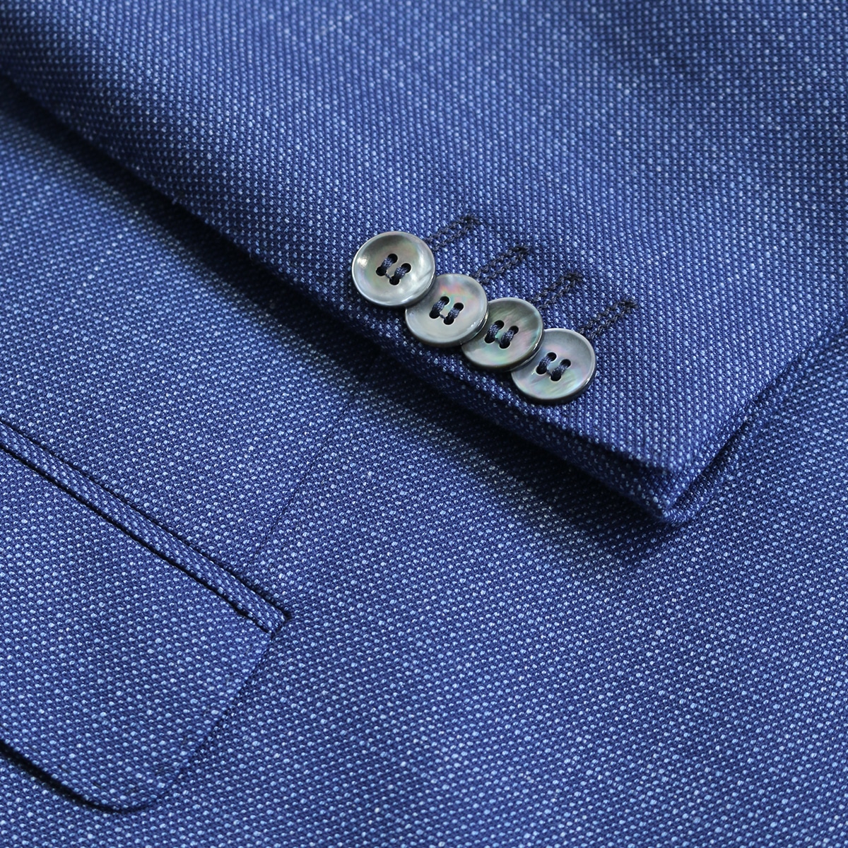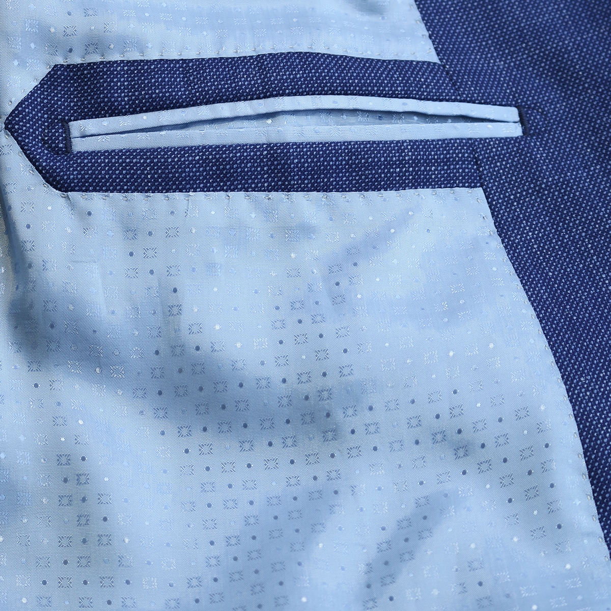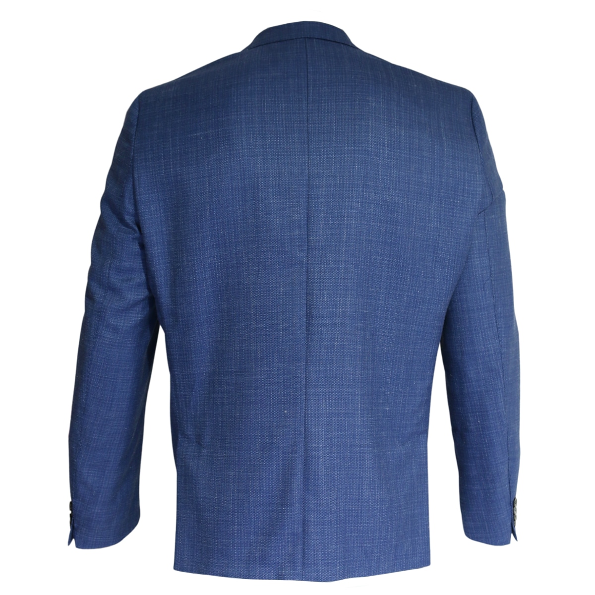 This Carl Gross blue jacket is half lined, with two side pockets, inside pockets and side vents. The wool silk and linen blend makes for a great spring/summer piece.