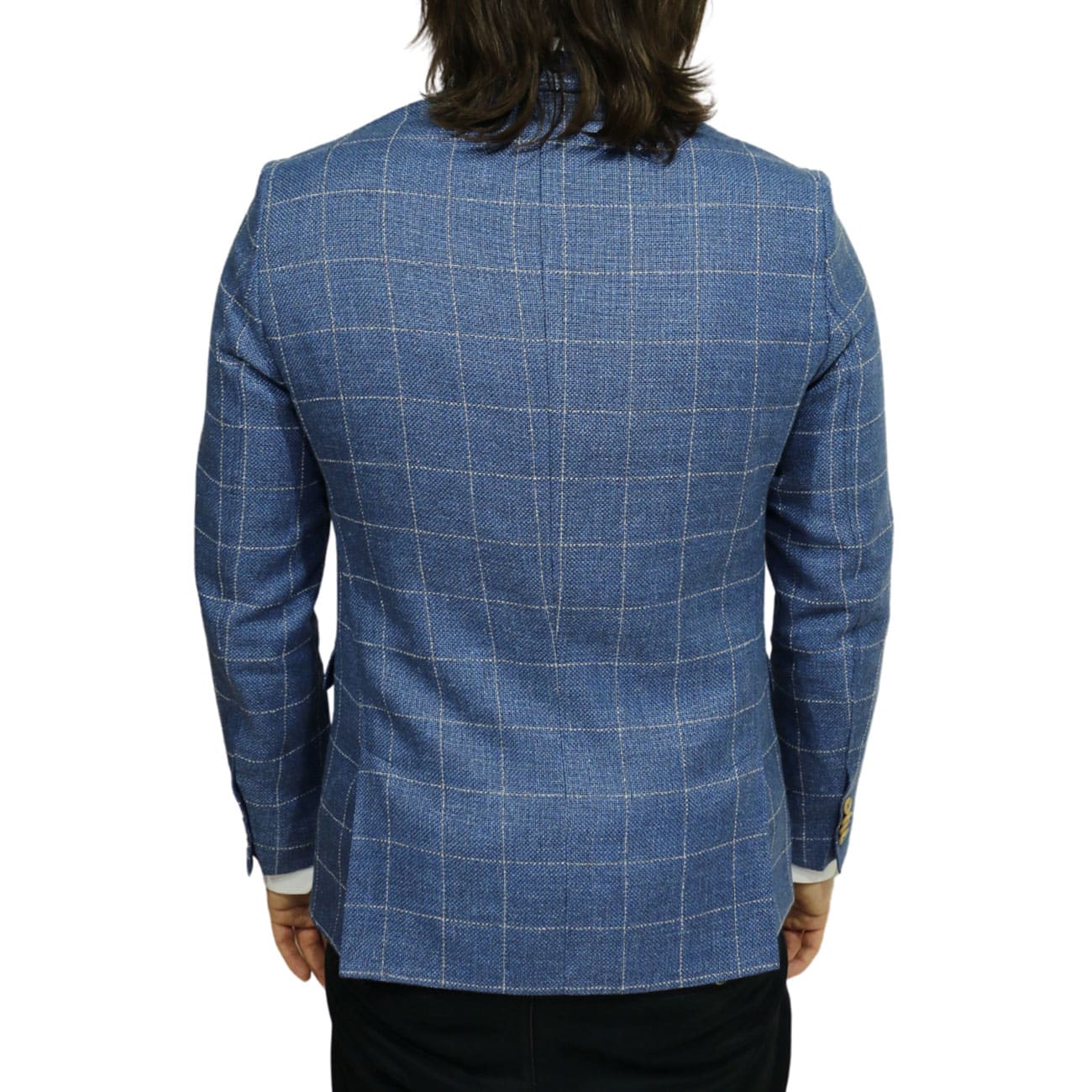 This Carl Gross light blue windowpane check jacket features a ticket pocket and side vents.the wool and linen material makes for a great spring/summer piece.