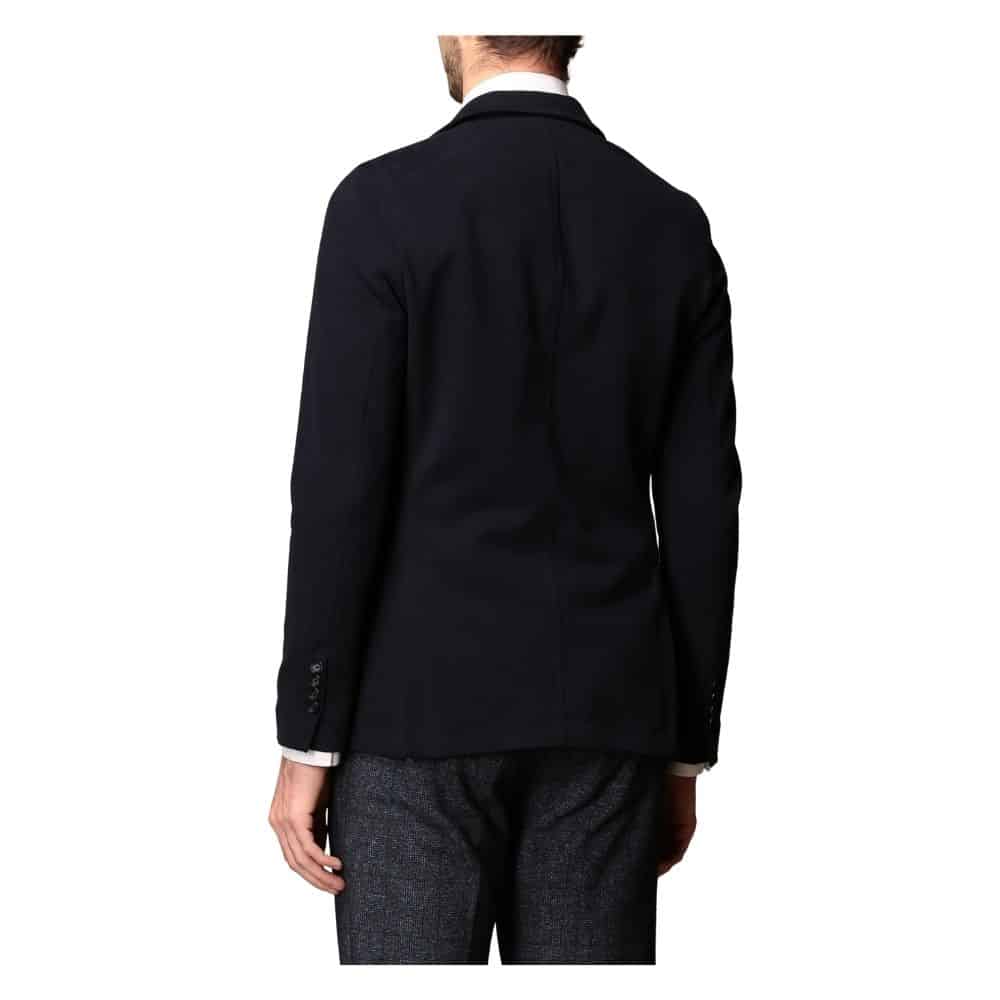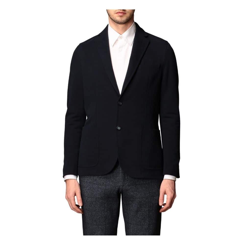 Men’s jacket in dark blue stretch cotton. Two buttons closed with upper pocket and side pockets. Cuffs with buttons and double rear slit and inner pocket.