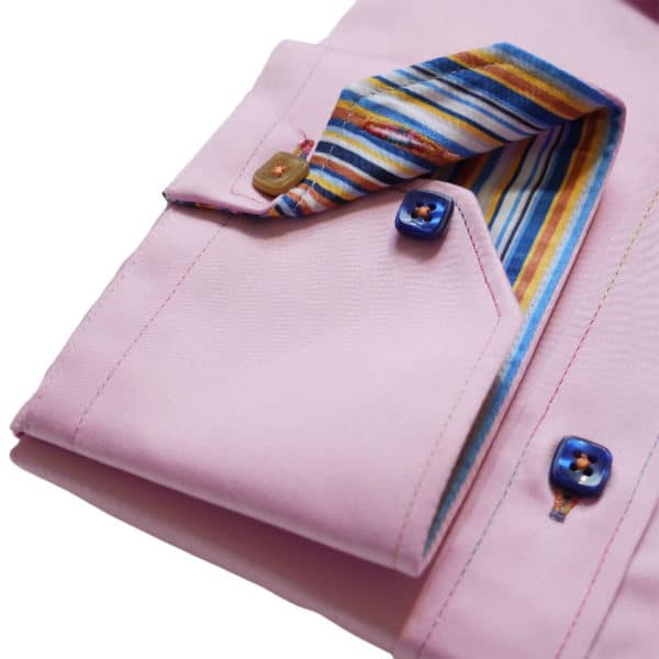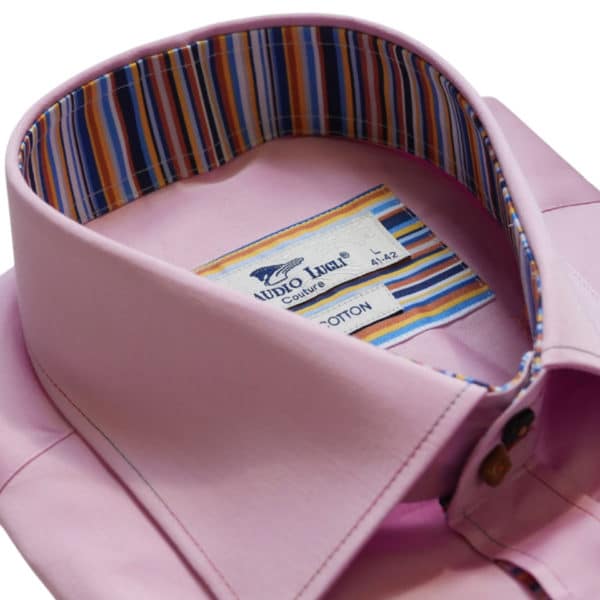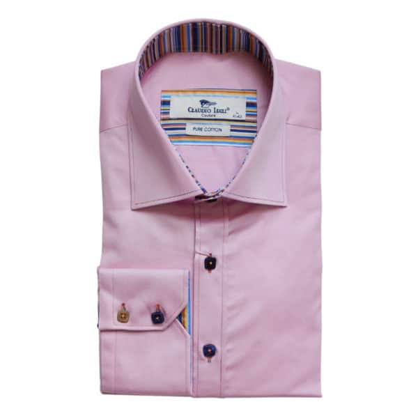 The Claudio Lugli CP5777 pink stripe trim shirt is a stylish smart casual piece that offers a dapper look. Stylish features of this shirt include striped trims inside the collar, cuffs and placket for cool detail. The shirt is finished off with multicoloured square buttons, button holes & stitching. For a neat look, this shirt has a tailored fit which sits close to the body.