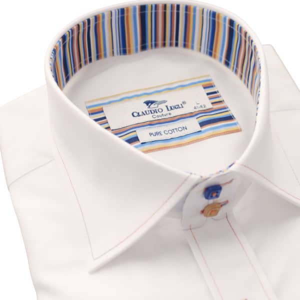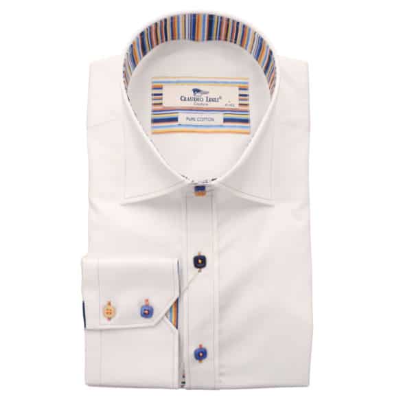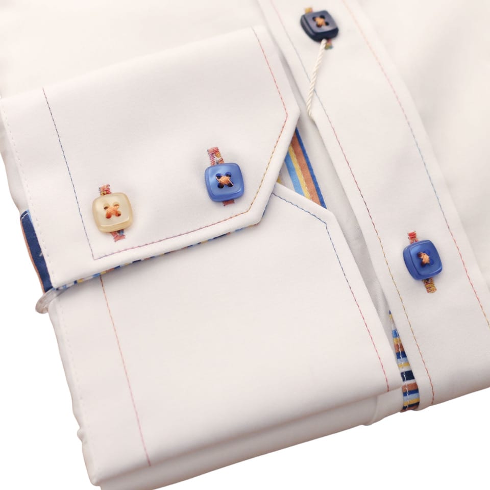 The Claudio Lugli CP5777 white multi stripe trim shirt is a stylish smart casual piece that offers a dapper look. Stylish features of this shirt include striped trims inside the collar, cuffs and placket for cool detail. The shirt is finished off with square buttons, button holes & stitching. For a neat look, this shirt has a tailored fit which sits close to the body.