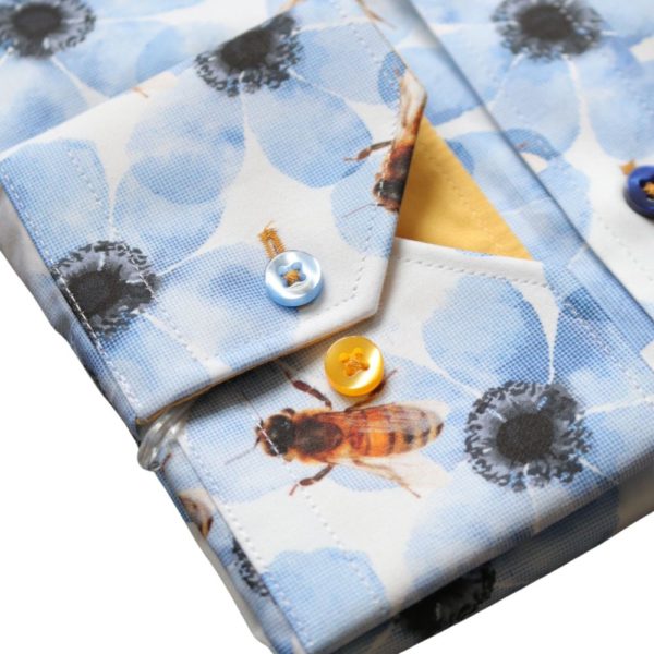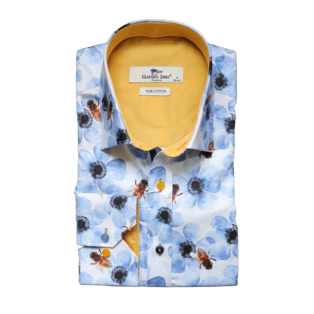 This shirt from the infamous shirt specialist Claudio Lugli features a crisp blue cotton fabric, with an all over bee’s print for a cool look. Claudio Lugli has really considered the finer details with this shirt the cutaway cuffs allow for watches to be visible when worn underneath and the coloured buttons add a vibrant design touch. This shirt is cut to a tailored fit to ensure that it is comfortable whilst retaining a modern look.