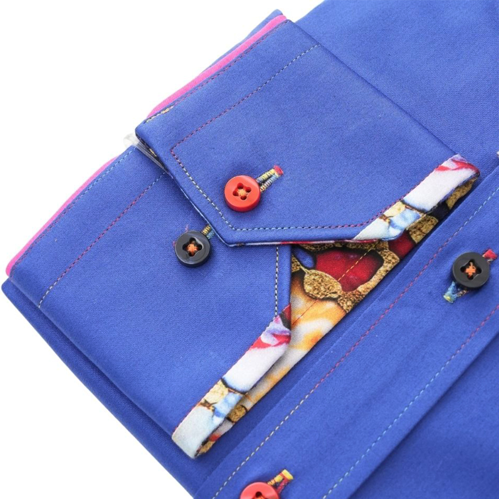 This Blue Claudio Lugli Shirt combines bold style with refined elegance. Featuring a vibrant psychedelic pattern on the collar and cuffs, and unique square buttons, it adds flair to any outfit. Perfect under a blazer for a sharp look or untucked with jeans for effortless style