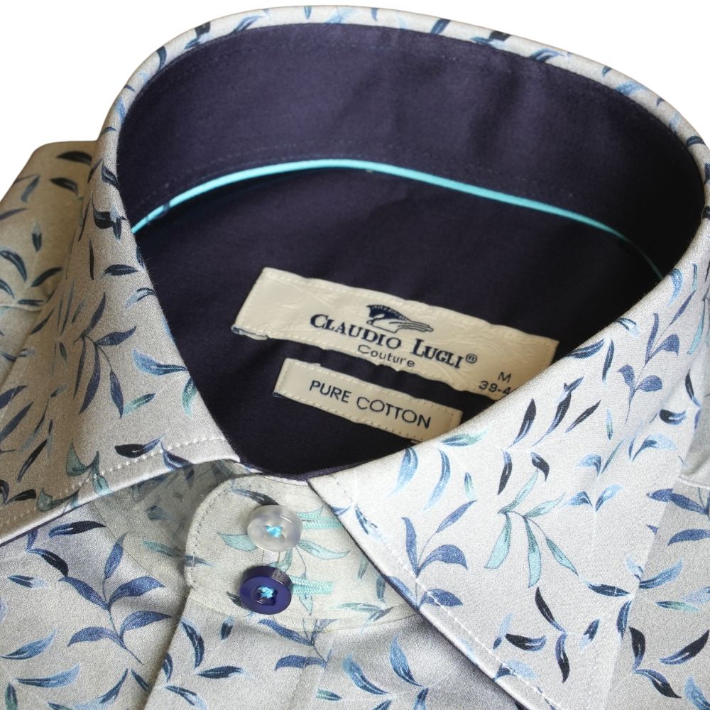 This grey shirt from Claudio Lugli features a small leaf pattern printed on crisp cotton fabric. Claudio Lugli has really considered the finer details with this shirt. The cutaway cuffs allow for watches to be visible when worn underneath. This shirt is cut to a tailored fit to ensure that it is comfortable whilst retaining a modern, slim look.