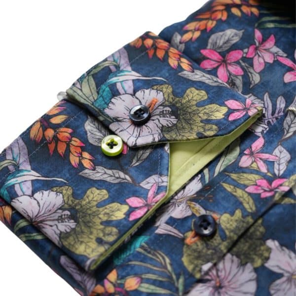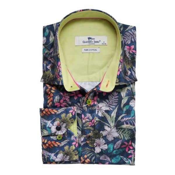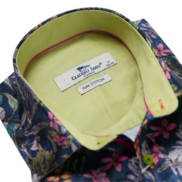 This blue shirt from Claudio Lugli features a Hawaii floral pattern printed on crisp cotton fabric. Claudio Lugli has really considered the finer details with this shirt. The cutaway cuffs allow for watches to be visible when worn underneath. This shirt is cut to a tailored fit to ensure that it is comfortable whilst retaining a modern, slim look.
