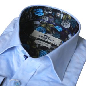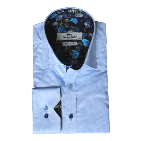 This blue shirt from Claudio Lugli features a crisp cotton fabric with a jacquard pattern, a floral pattern inside the collar, cuffs, and has contrasting buttons for cool look. Claudio Lugli has really considered the finer details with this shirt the cutaway cuffs allow for watches to be visible when worn underneath and the coloured buttons add a vibrant design touch. This shirt is cut to a tailored fit to ensure that it is comfortable whilst retaining a modern, slim look.