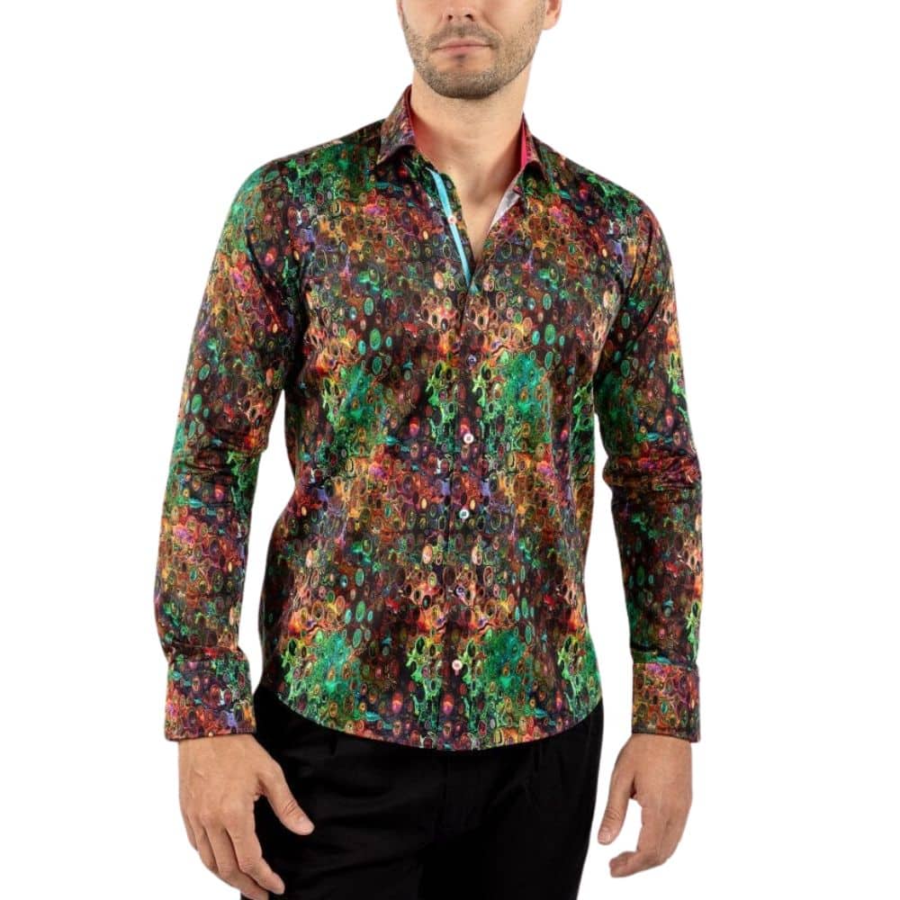 This Claudio Lugli shirt features an oil slick print in pink and green, creating a vibrant and and eye-catching look.
