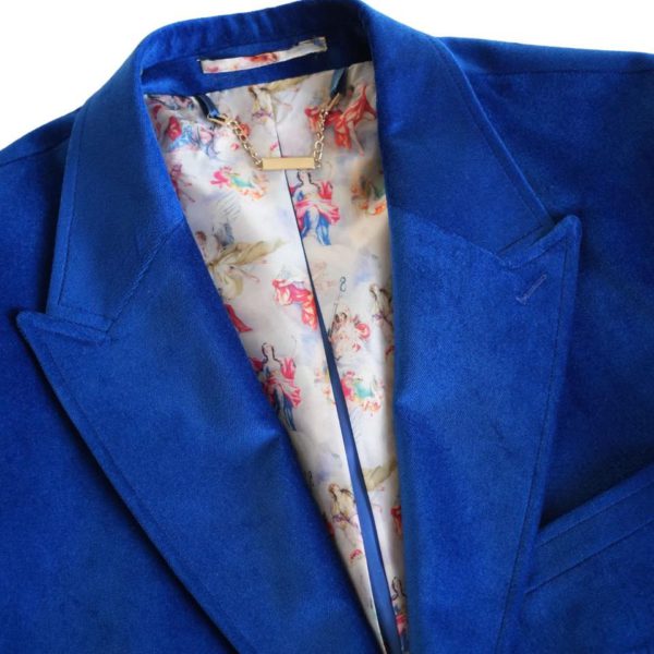 This velvet blue jacket features a renaissance lining. A great piece for any formal occasion combined with a white dress shirt and black trousers to complete the look.