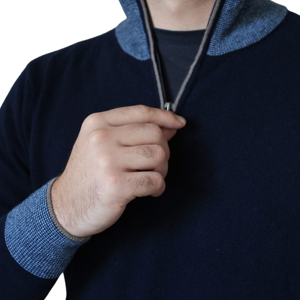 This Codice navy half zip jumper is made from a wool, cashmere technical fibre blend fabric. Features contrast details at the collar and cuffs. This piece works well with our selection of smart pieces such as shirts, as well as being suited to a more casual outfit.