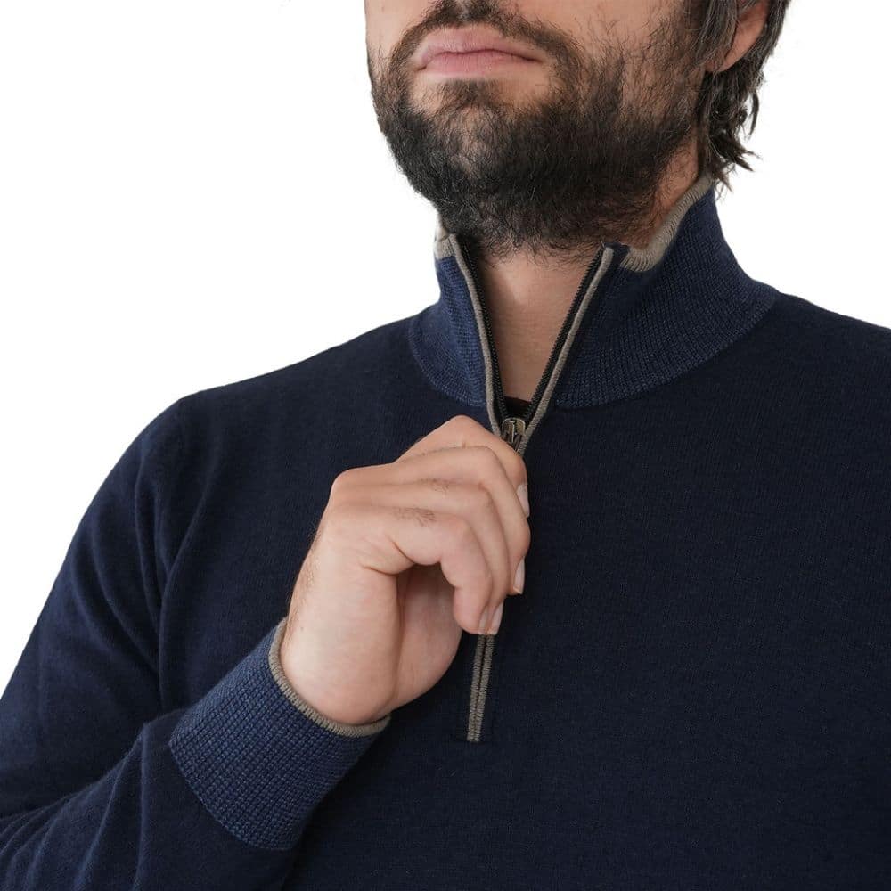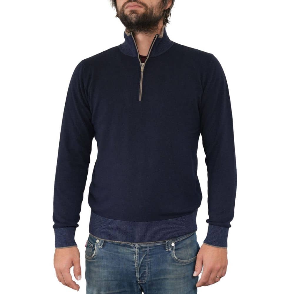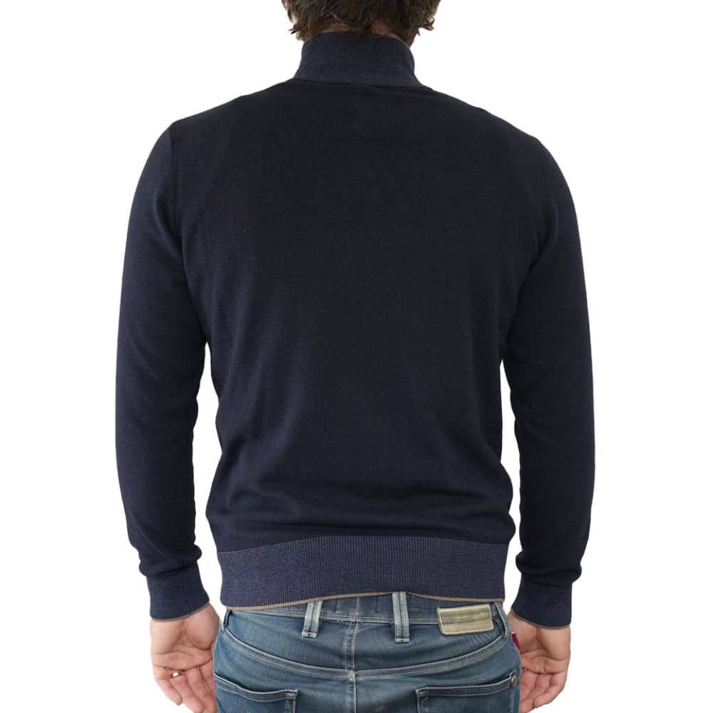 This Codice navy half zip jumper is made from a wool, cashmere technical fibre blend fabric. Features contrast details at the collar and cuffs. This piece works well with our selection of smart pieces such as shirts, as well as being suited to a more casual outfit.