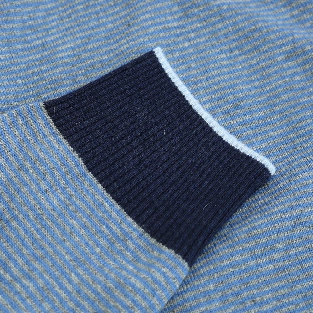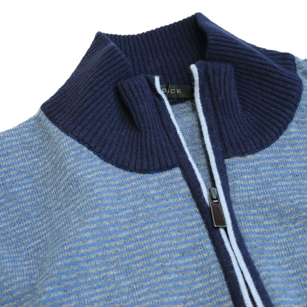 Codice Blue/Grey half zip jumper made from a wool, cashmere and a technical fibre blend fabric with stripes. Features navy ribbed collar and stripes and light grey trim.