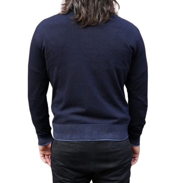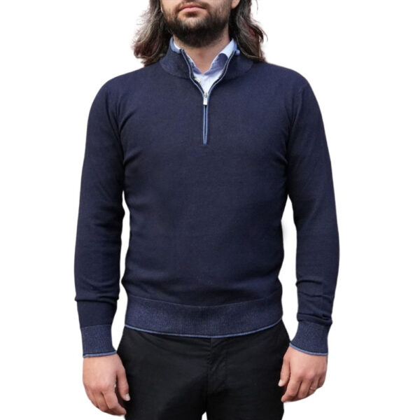 This Codice navy blue half zip jumper is made from a wool, cashmere technical fibre blend fabric. Features contrast details at the collar and cuffs. This piece works well with our selection of smart pieces such as shirts, as well as being suited to a more casual outfit.