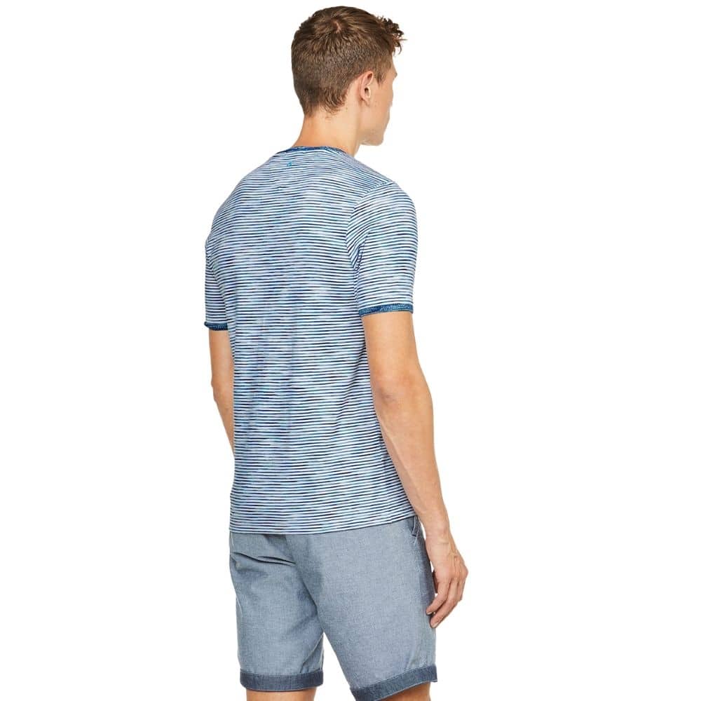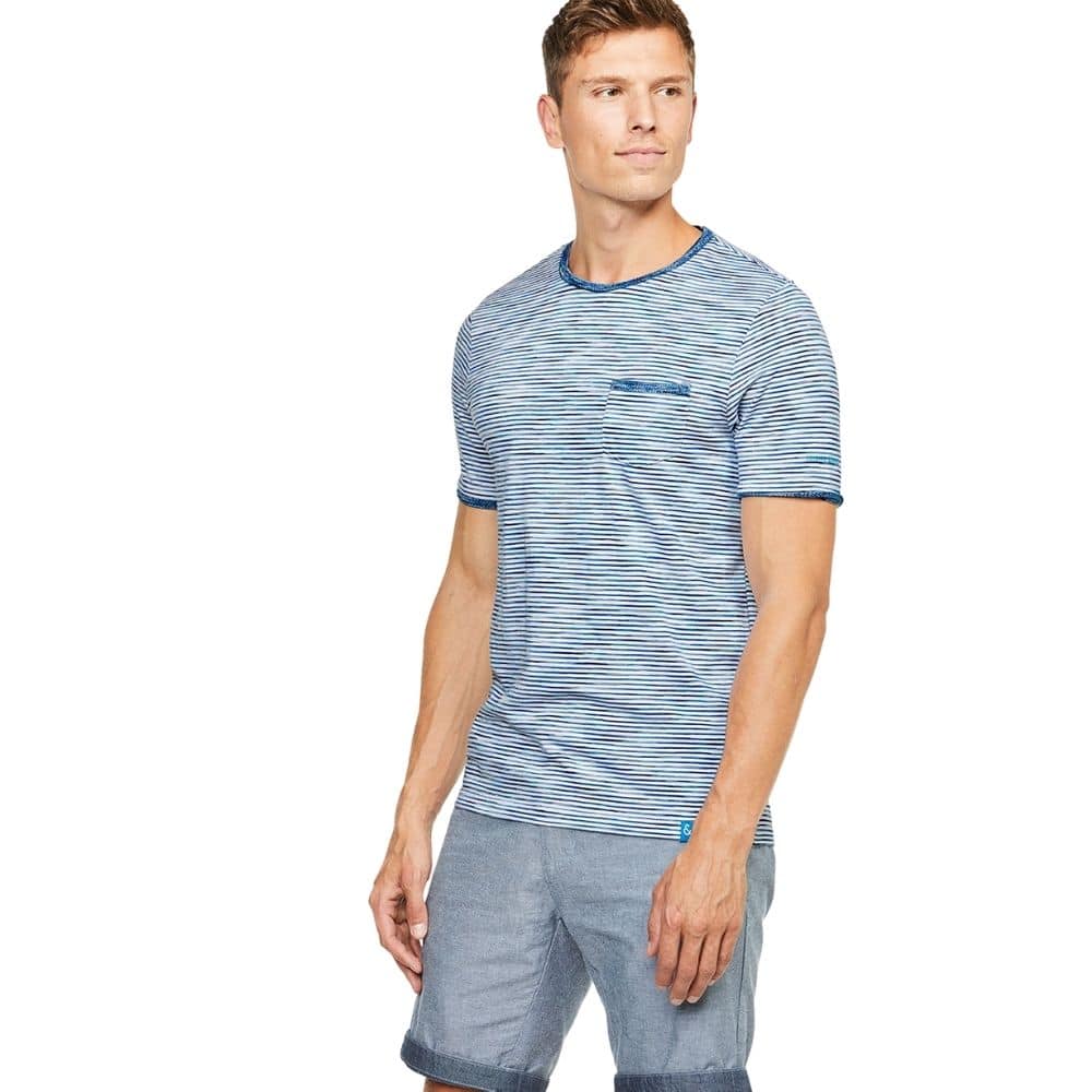 The Colours & Sons Blue Space Dyed T-shirt is a stylish casual piece. The fabric has a horizontal striped pattern with a space dye for a distinctive texture. The crewneck, cuffs and chest pocket feature a contrasting blue for detail. This t-shirt is finished with branding at the hem.