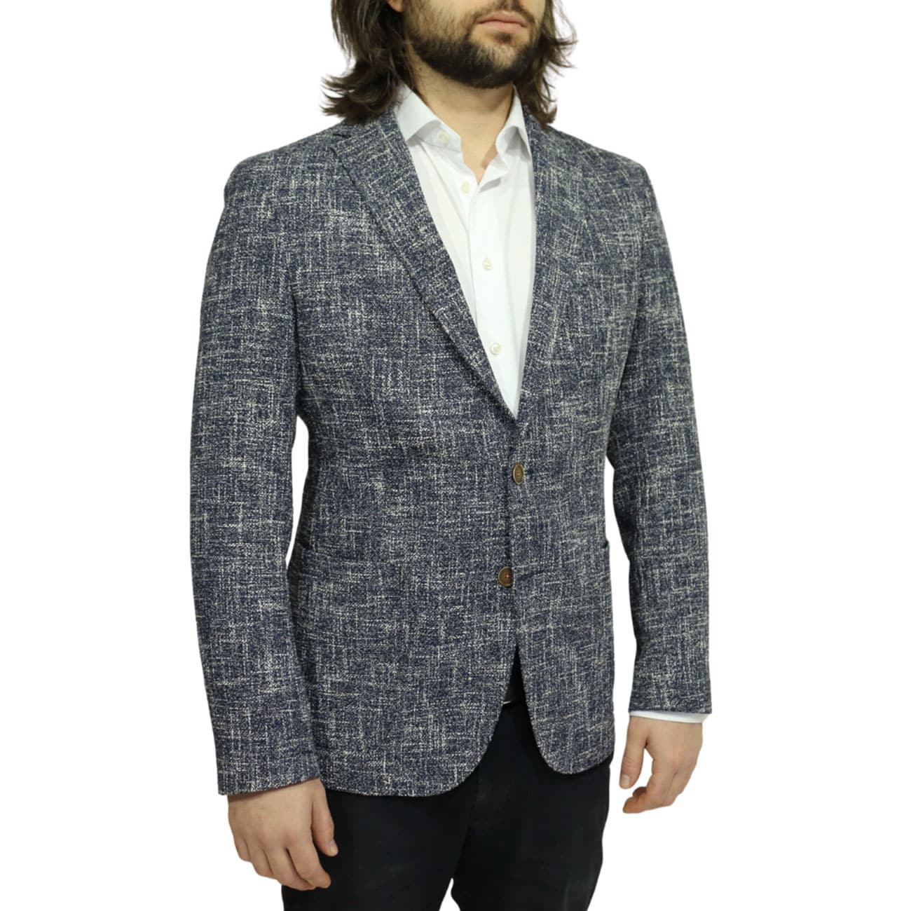 The Digel Navy and White Slub Smart Jacket is a contemporary piece with distinctive styling. The slub material has a woven texture for a rustic look; it is thick and soft to feel like a sweater. For comfort and ease of movement, this jacket is unstructured. Cut for a slim fit, this jacket sits close to the body for a neat shape.