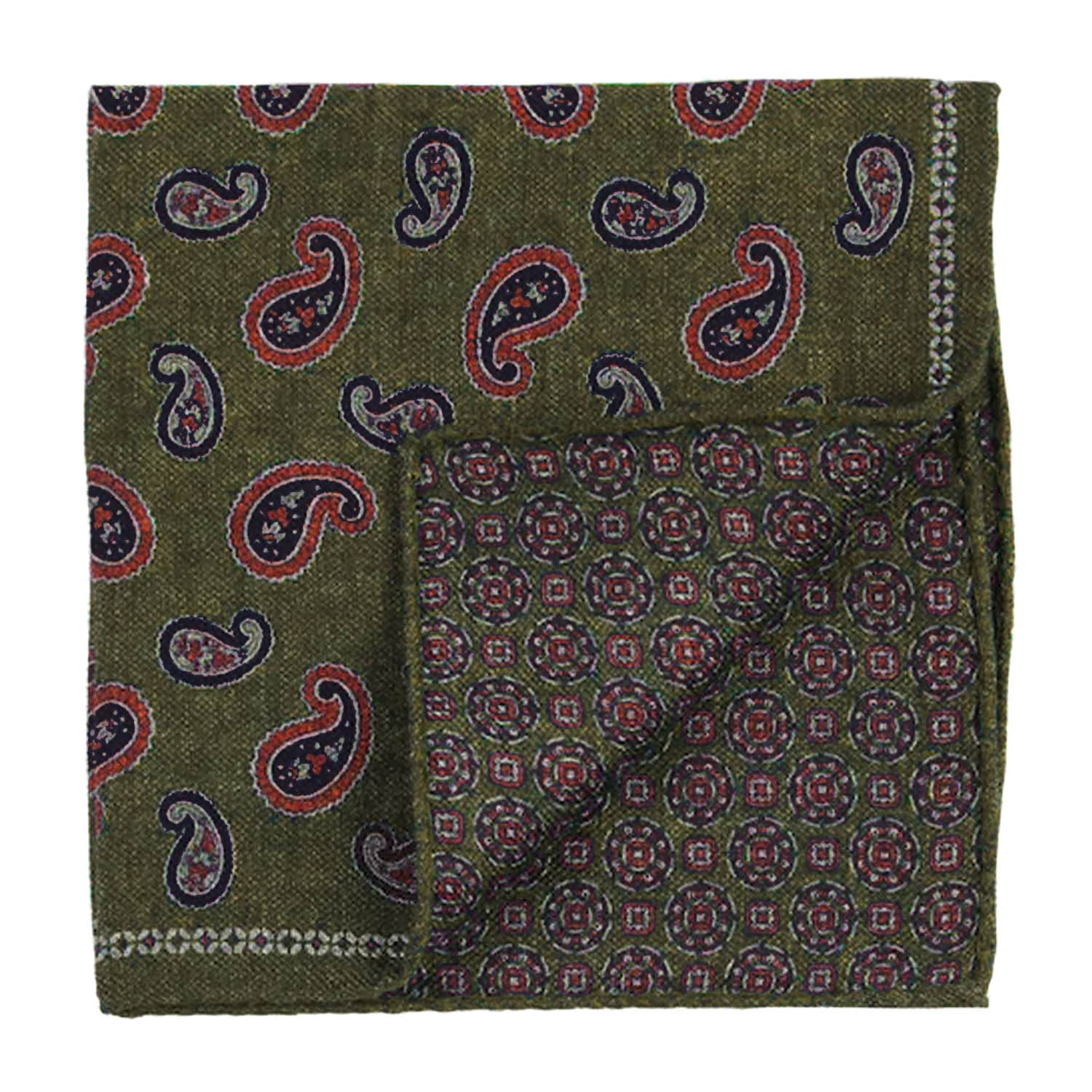 Amanda Christensen Classic double-sided green pocket square with paisley & geometric pattern background.