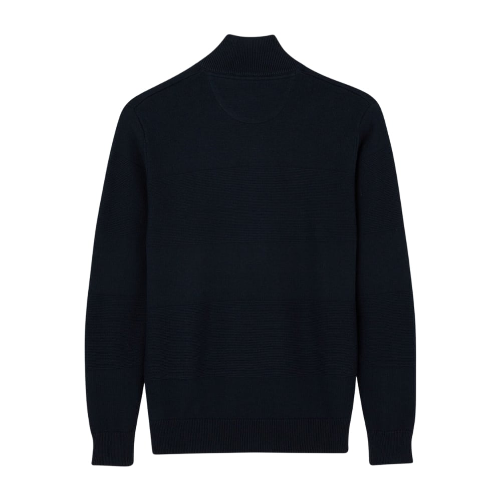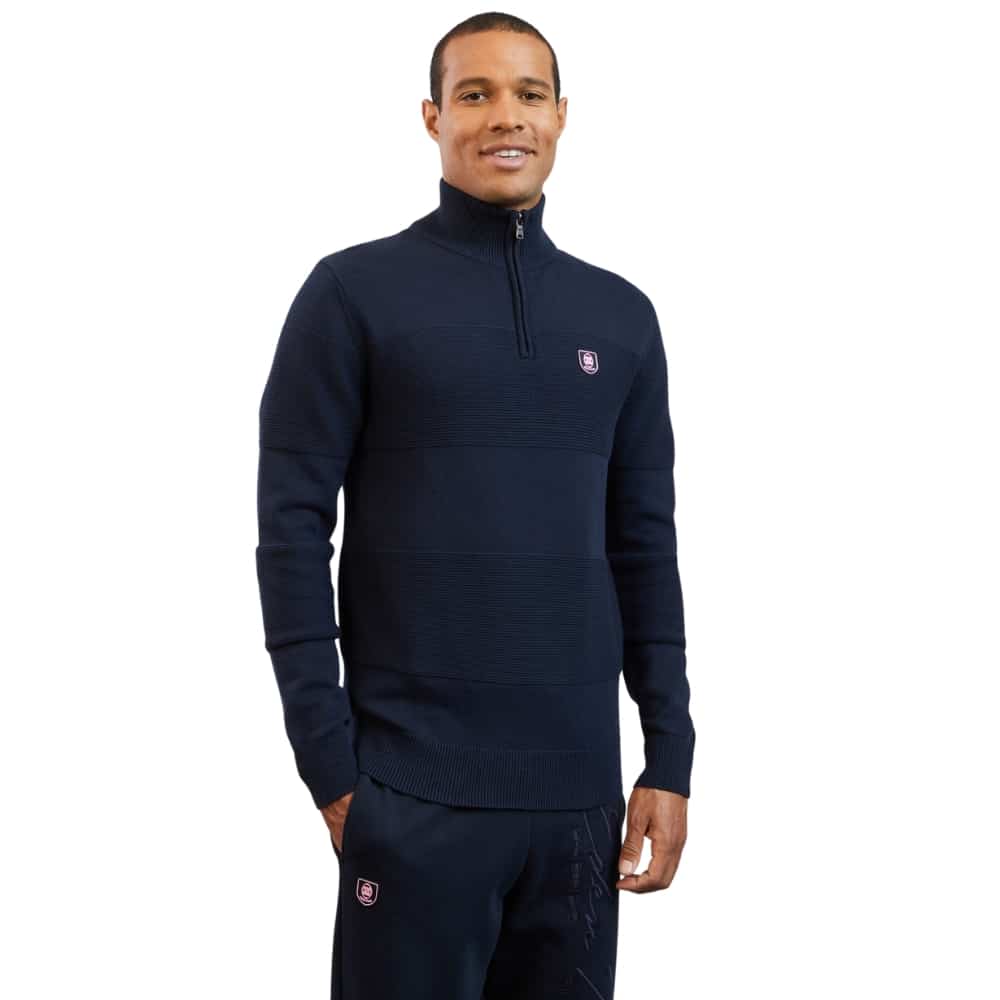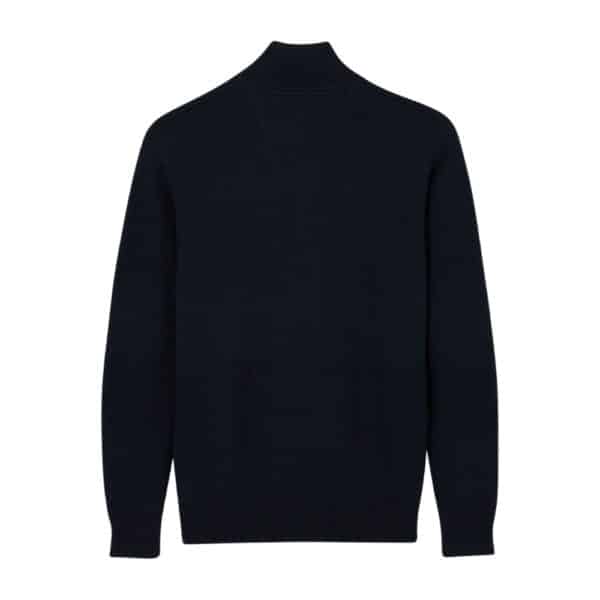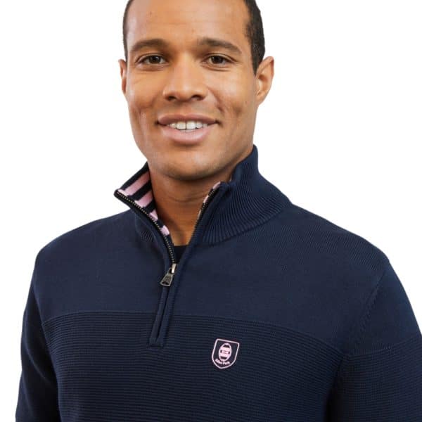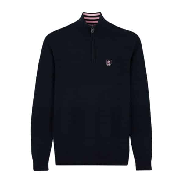 This plain coloured jumper features a handsome combination knit in jersey and moss stitch. It also has a silicone crest logo badge on the breast, and ribbed trims. The zipped high collar has two-tone stripes on the back
