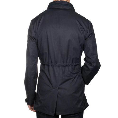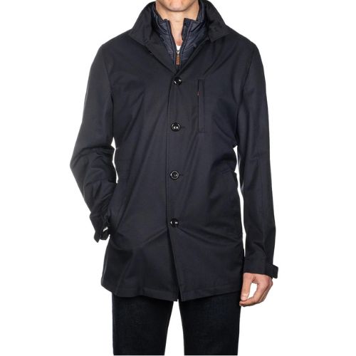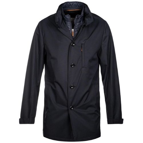 The Eduard Dressler Darius Navy Overcoat with detachable insert is a lightweight, waterproof, versatile piece for cold and wet weather. The outer shell has a classic shape with button closure; made with a technical soft lightweight shell. Inside is a detachable liner for superb insulation; the liner can be zipped out for wearing in warmer weather. Concealed hood in collar, front pockets and a front zip pocket complete this effortless garment.