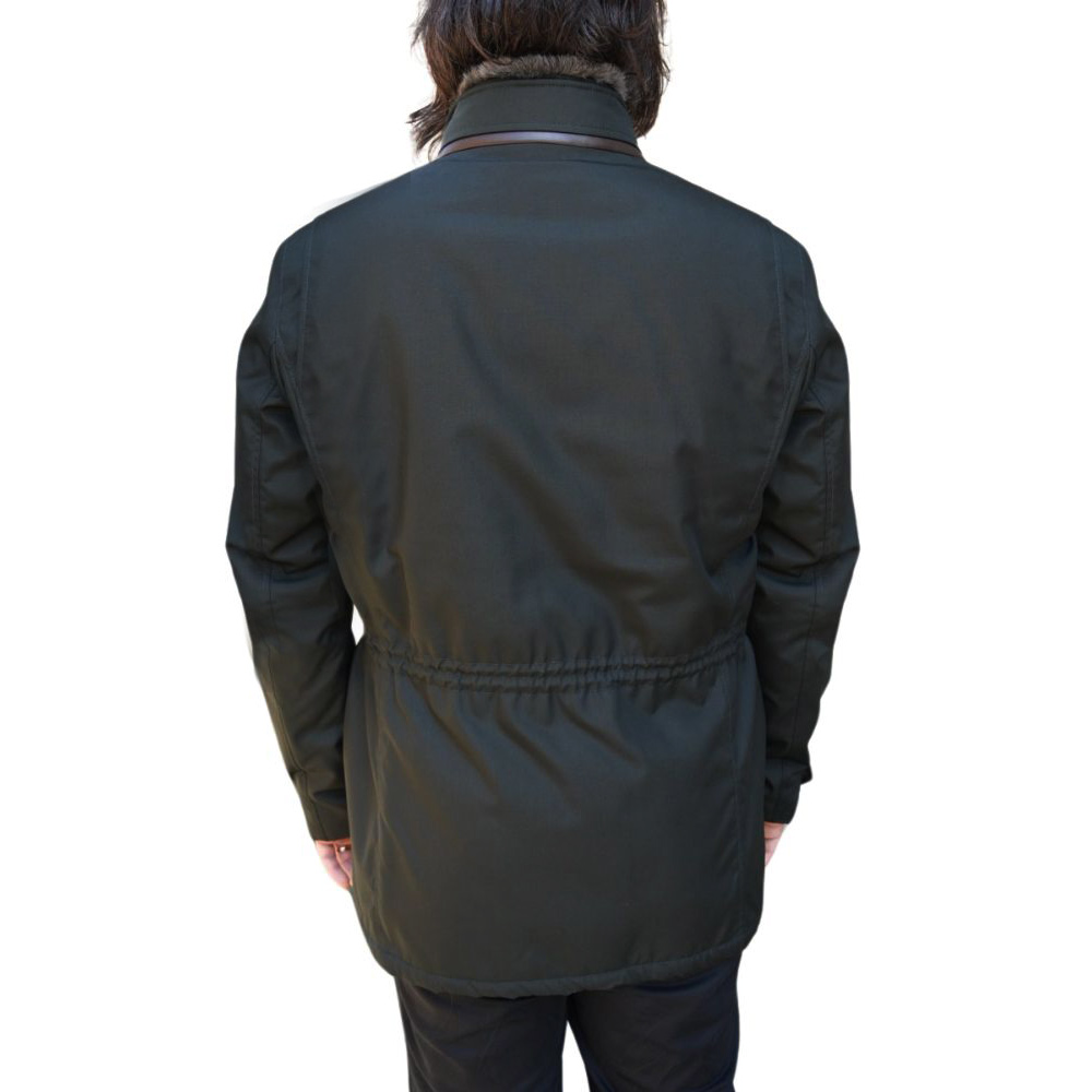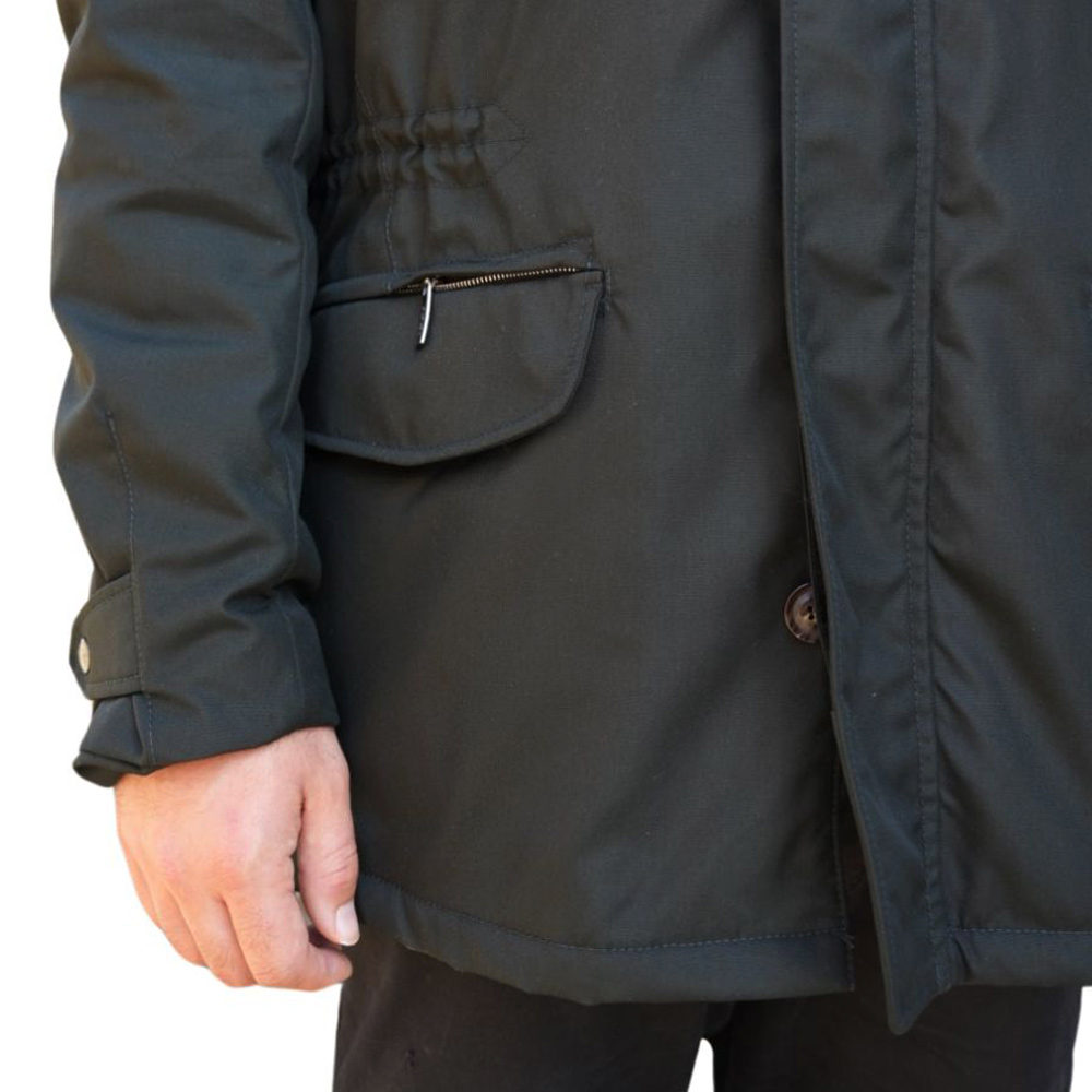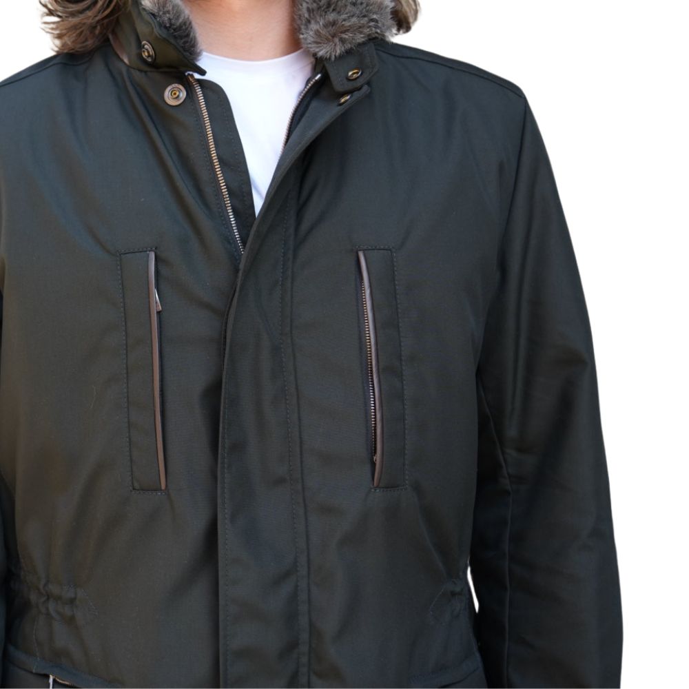 The Eduard Dressler Filippo coat in Black is a warm, practical outer layer for cold and wet weather. Win and Waterproof with a detachable fur lining in the collar and brown piping along the bottom of the stand up collar. 5 front pockets (including a hidden zip on the front right patch pocket and 2 internal zip pockets.
