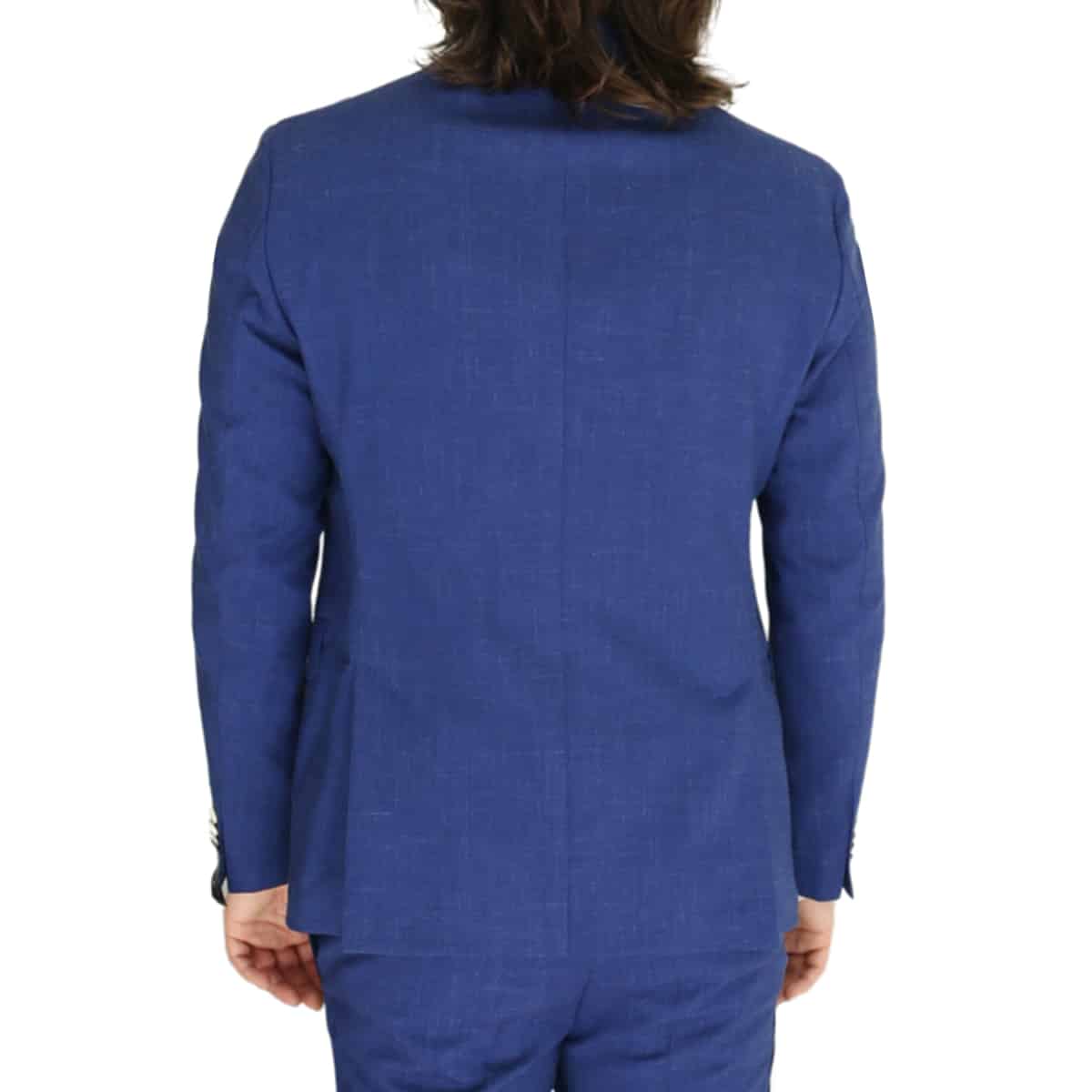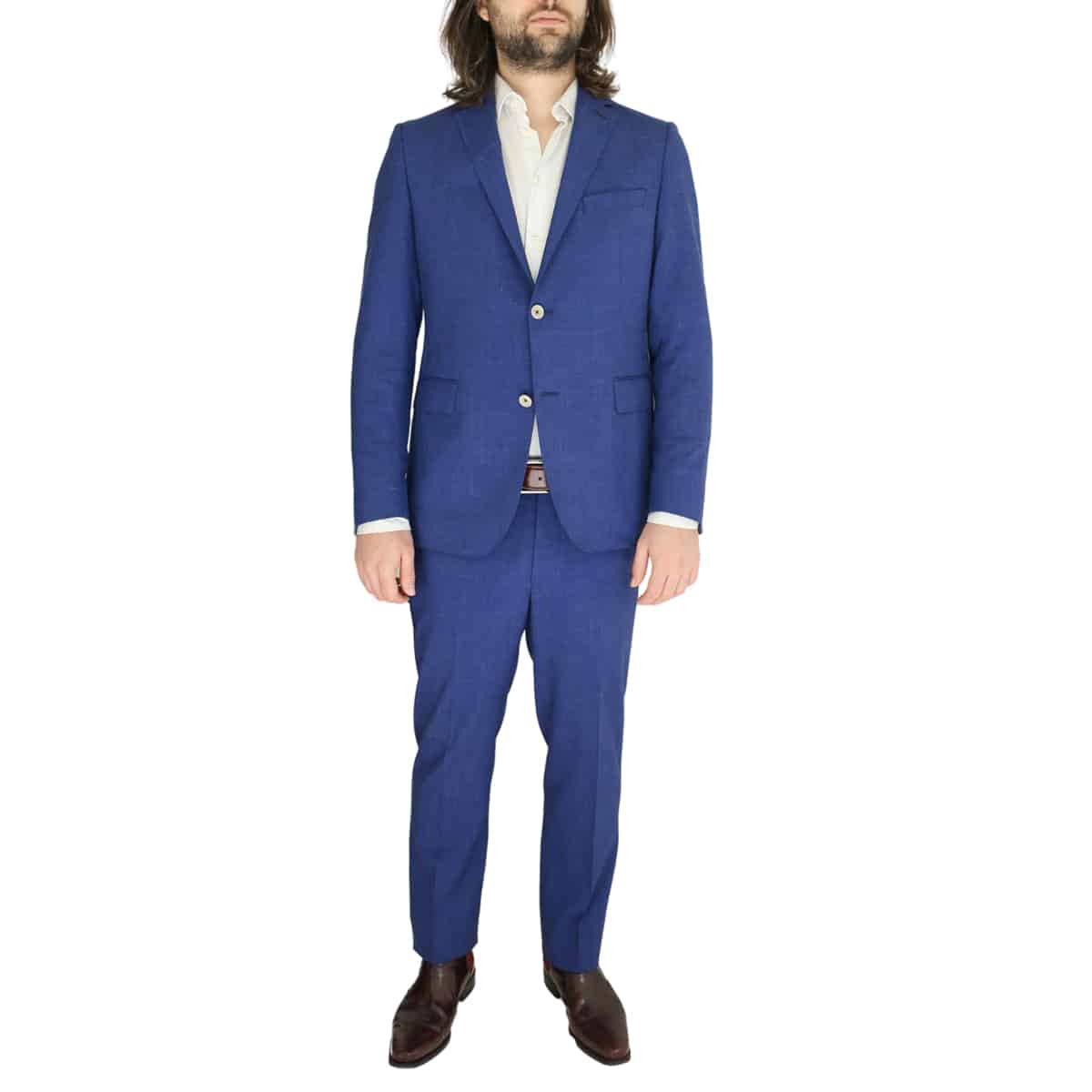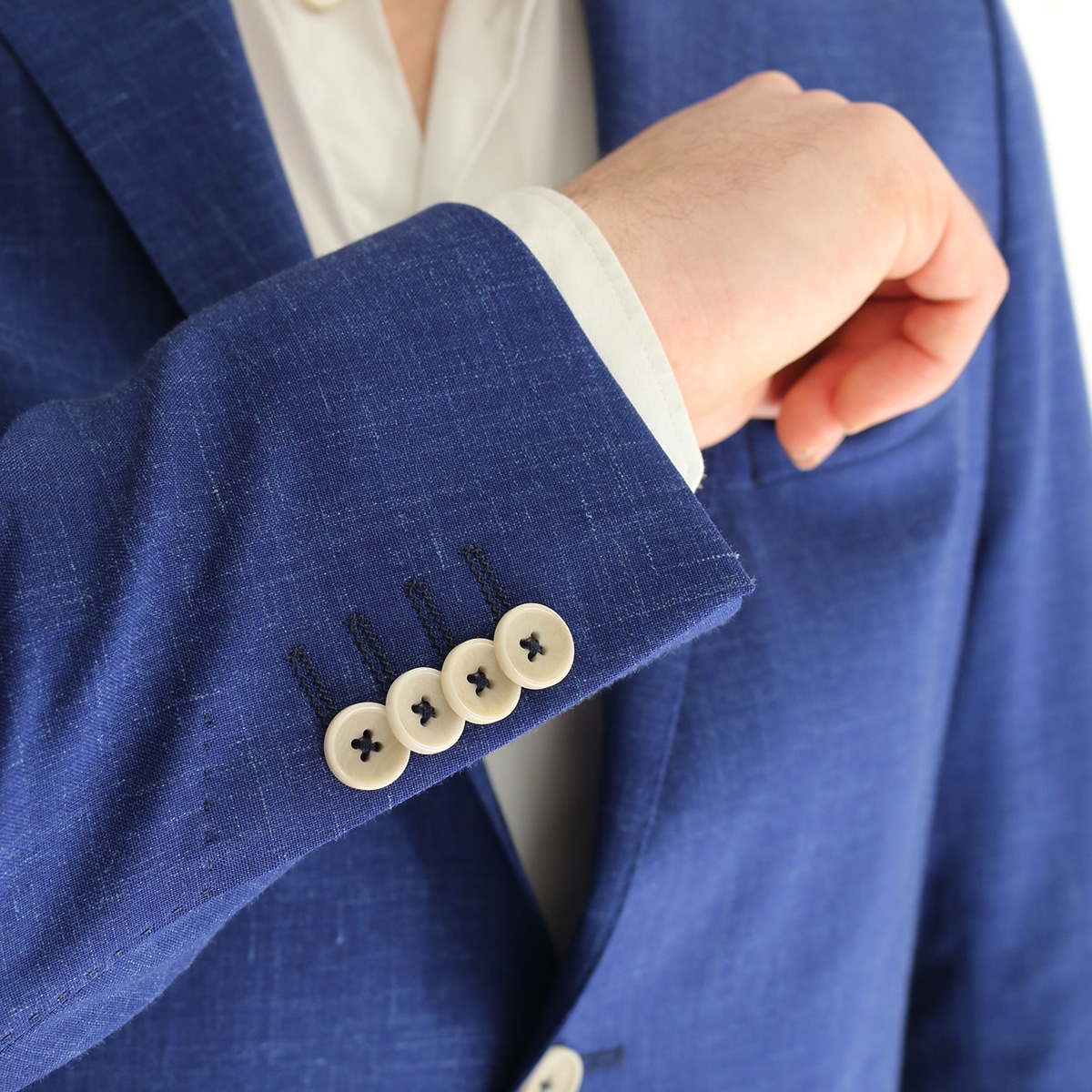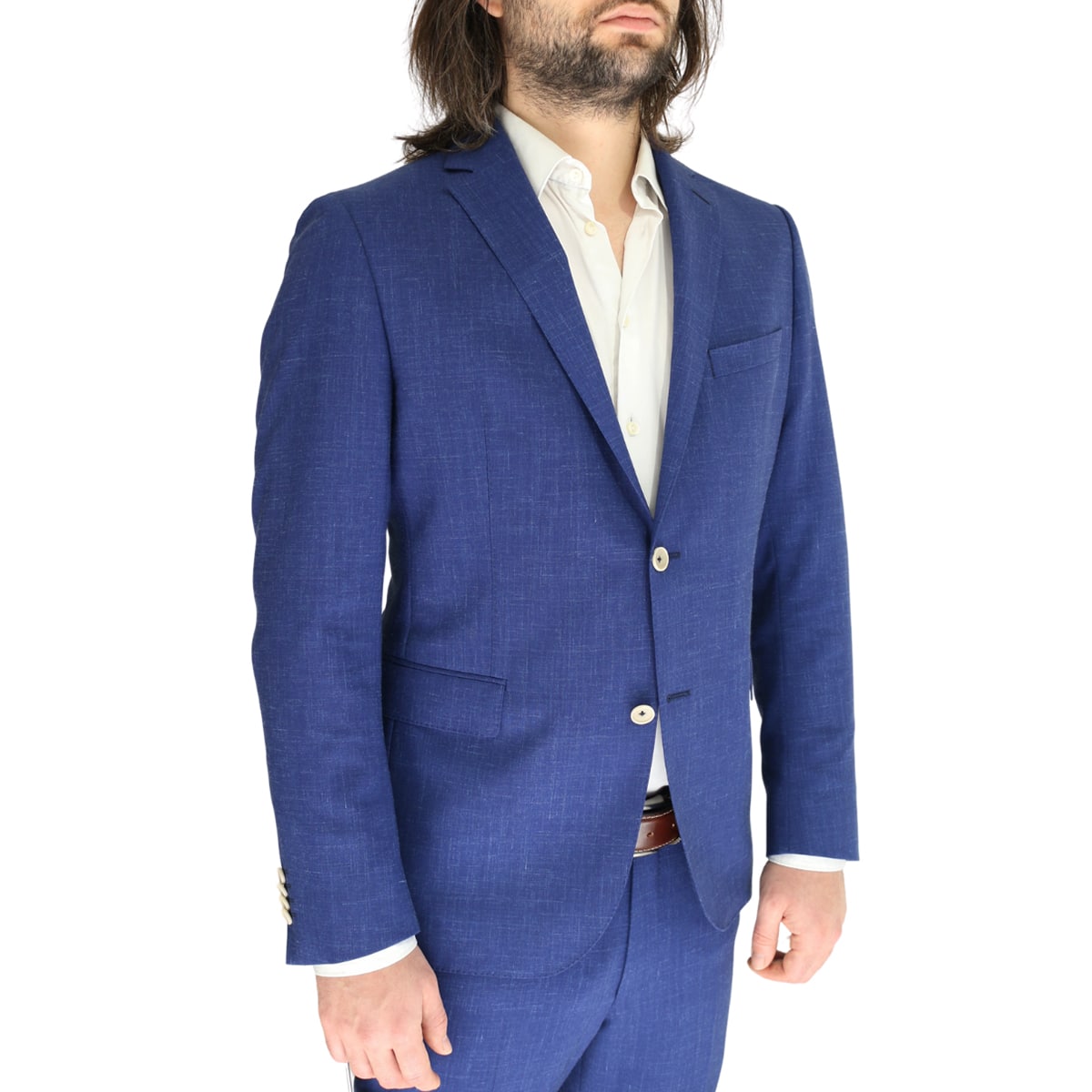 This Eduard Dressler Blue Wool and Linen Smart Jacket is ready for when temperatures rise. This two button jacket is made from a crisp wool and linen blend fabric so it is lightweight and cool. It is unstructured, and is cut to a slim fit, ensuring both comfort and a great shape when worn.