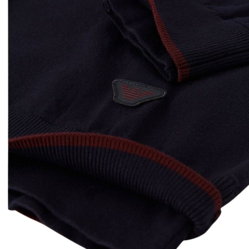 This Emporio Armani Trim Detail Crewneck in Navy is an essential knitwear piece for the casual wardrobe. Characterised by its ribbed decorated with contrasting burgundy trim detail, this sweater has a distinctive look. The eagle logo patch at the bottom adds a touch of Armani style.