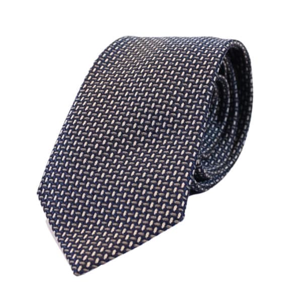 The Emporio Armani Dash Pattern Tie in Navy and Blue is cut from quality silk and features an embroidered motif of dashes in two colours; white standing vertically and blue running horizontally. The tie is complete with a keeper loop on the back for folding.
