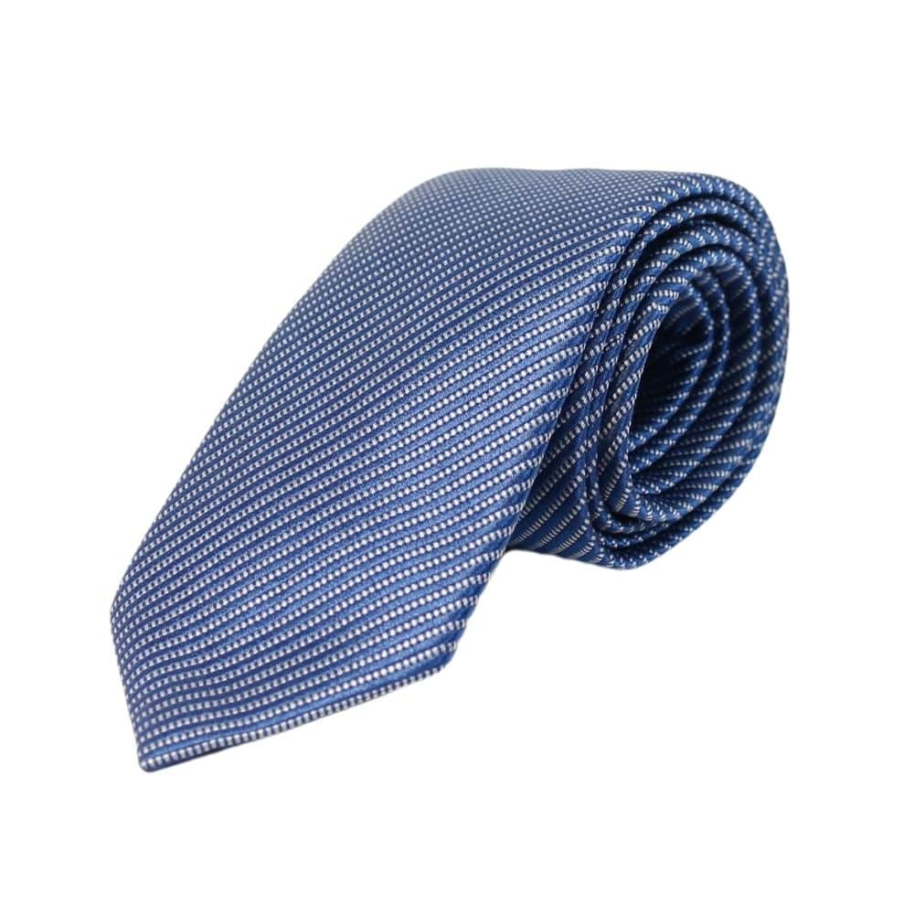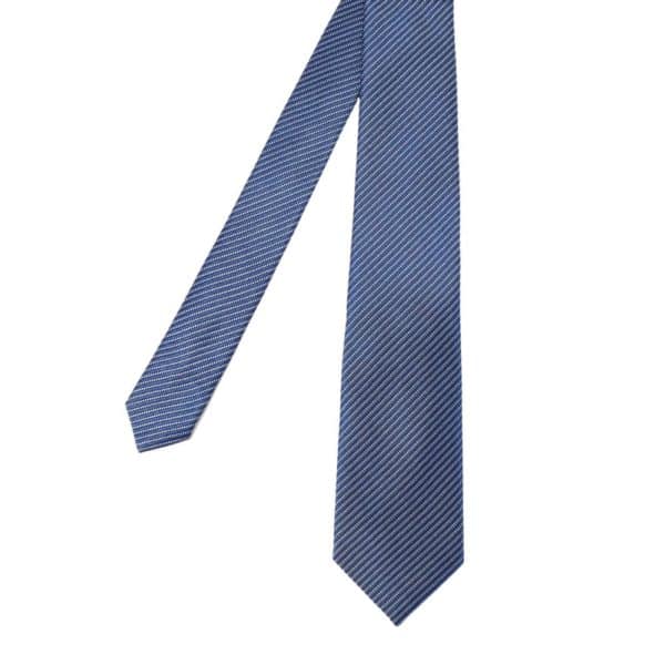 The Emporio Armani Diagonal Mini Weave Tie in Blue is made in Italy from quality silk. The design features diagonal lines with a contrasting white weave pattern. A keeper loop on the back allows for neat folding.