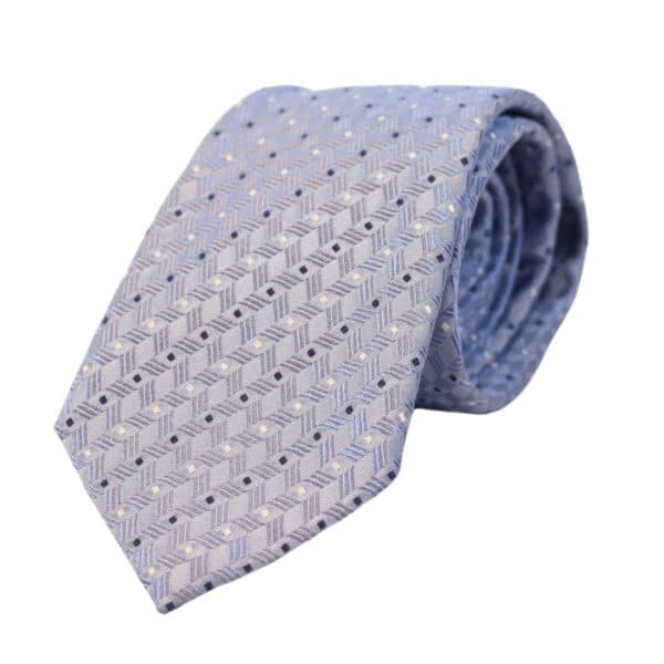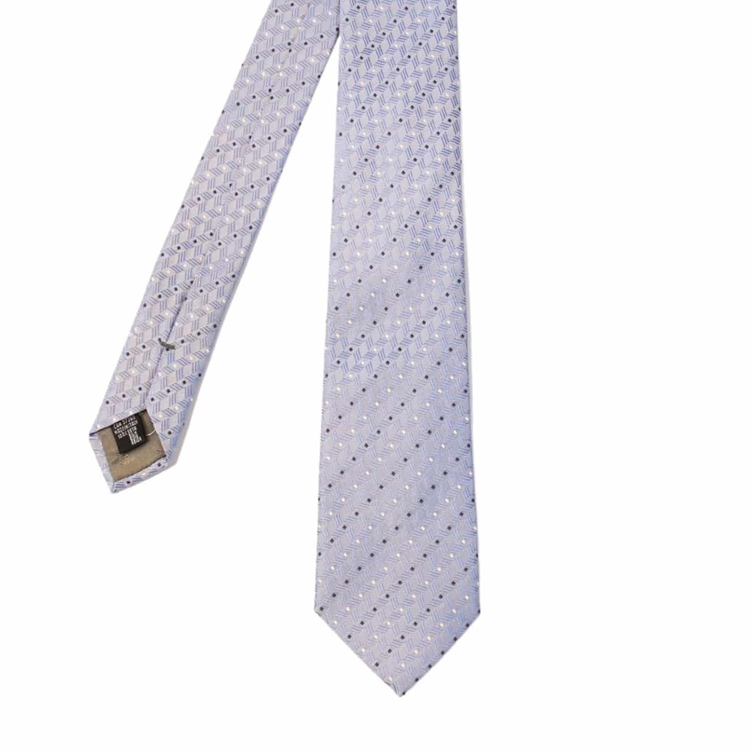 The Emporio Armani Diamond Stripe Tie in Light Blue is made in Italy from fine silk and features alternating diamond shapes with lines and white or blue diamonds inside.
