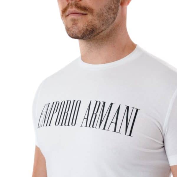 This Emporio Armani Logo Print T-Shirt is a blend of cotton and elastane and is white in colour. It has a crew neck and short sleeves. Emporio Armani branding is printed on the chest in black text essential for your wardrobe.