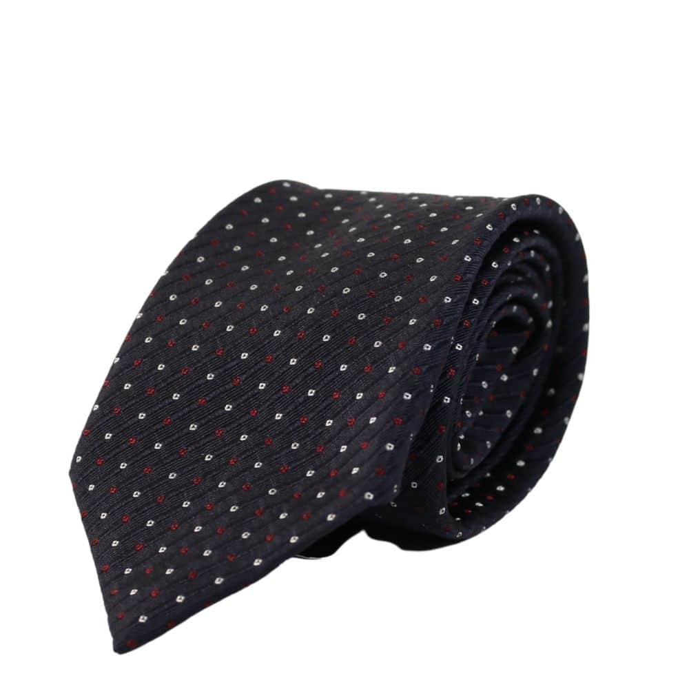 The Emporio Armani Diagonal Dots Tie in Navy is made in Italy from fine silk and features tonal coloured diagonal lines and embroidered circles in contrasting crimson and silver. The tie is complete with a keeper loop on the back for folding.