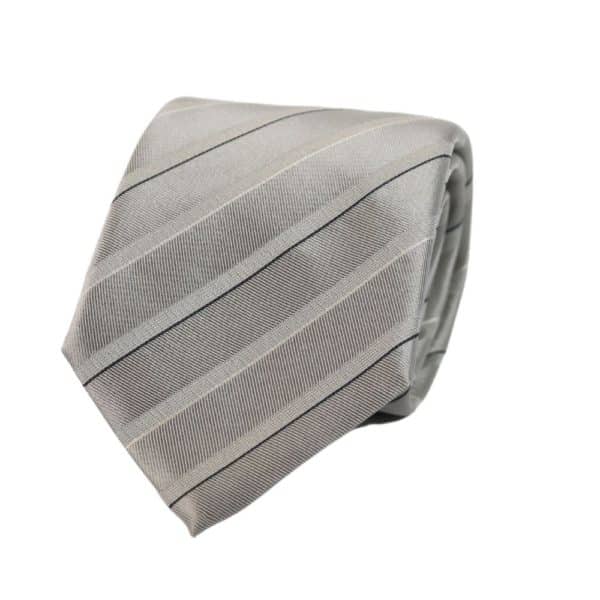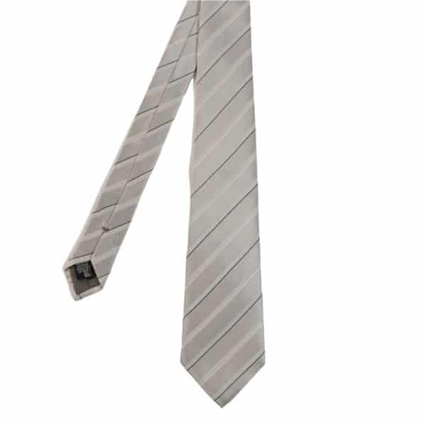 The Emporio Armani Regimental Tie in Silver is made in Italy from quality silk and features a tonal regimental stripe. The piece is complete with a keeper loop on the back. Look smart by pairing it with your well-tailored shirts.
