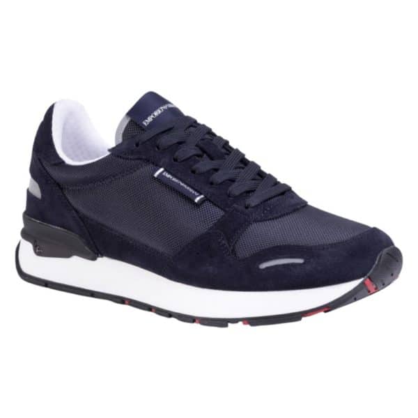 The Navy Runner Trainer from Emporio Armani features a classic sports design inspired by athletic shoes. The uppers feature suede and mesh pannels; the mesh allows for cooling in hot temperartures and breathability. The midsoles are rubber for cushioning with insoles for extra comfort and outsoles are treaded for traction. Wear these trainers to add a sporty touch to your outfits.