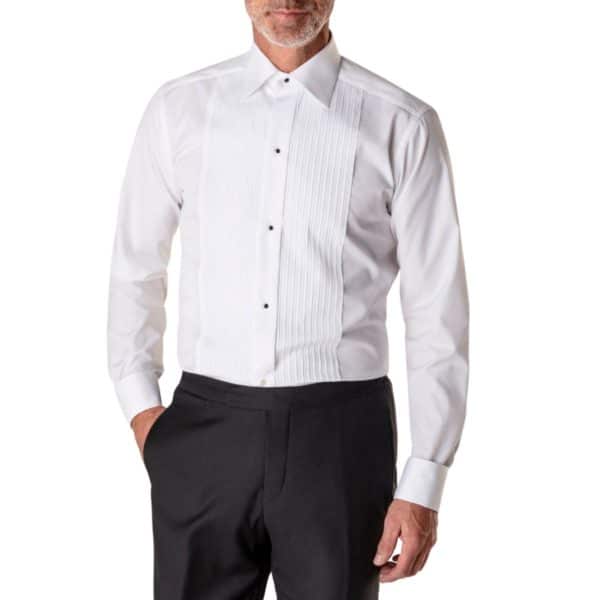 This elegant shirt with a pleated front is made for formal black-tie outfits. Cut from a plissé fabric, it does not require ironing. A sophisticated wing collar, French cuffs, and black stud buttons create a timeless and elegant appearance. A sophisticated choice for dress suits and tuxedos.