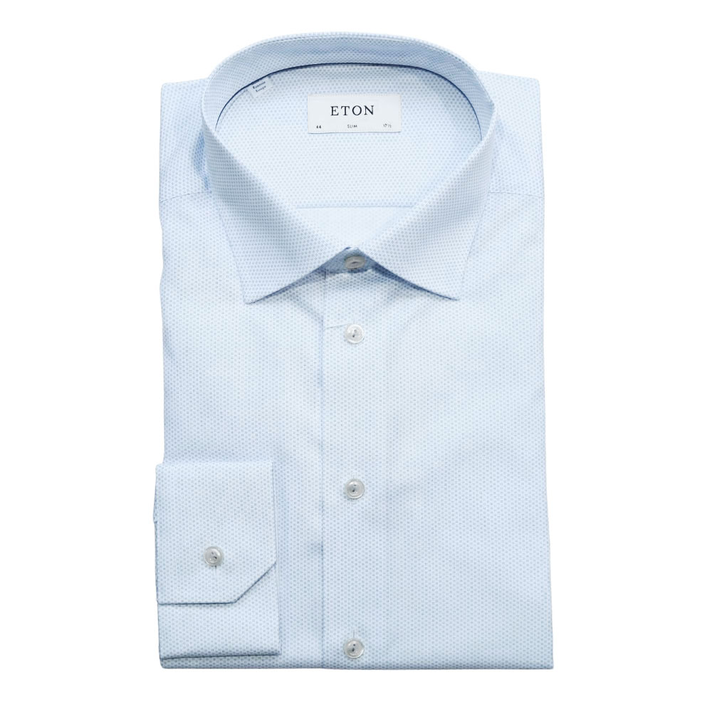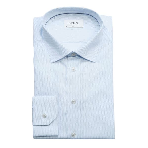 Eton is known for their superb shirts, made from high quality non- iron cotton & featuring a great cut. This dress shirt features a crisp white poplin cotton with a geometric micro print pattern. Slim fit, cut to be close fitting.