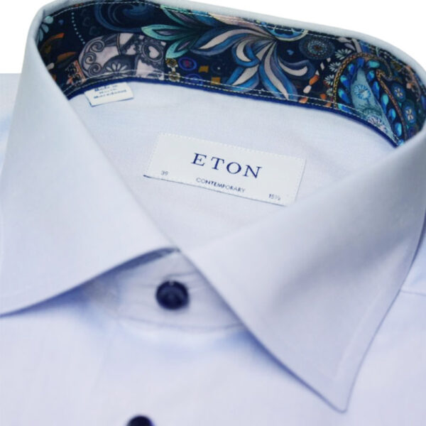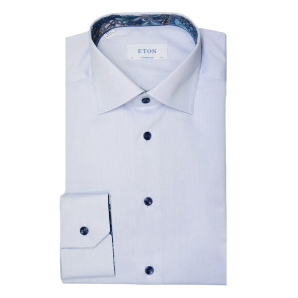 Eton’s most iconic shirt is enhanced with smart details: a micro geometric print inside the collar and cuffs and light blue buttons to contrast with the solid color of the main fabric. Made from our Signature Twill that combines outstanding wrinkle-free performance with elegant drapability for all-season wear, the stylish cuff and collar details add a contemporary twist.